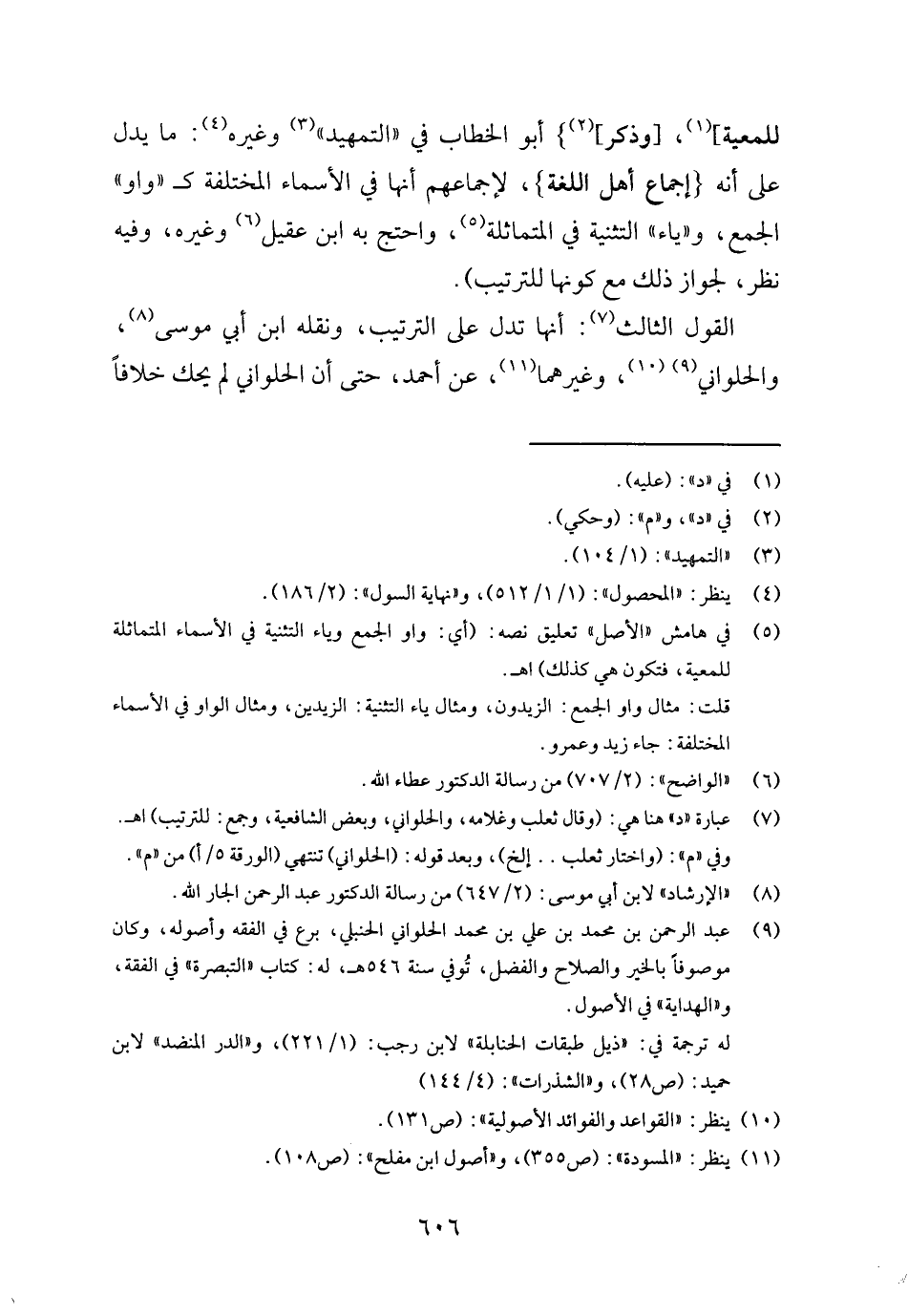 للمعية] ، [وَذكر] } أَبُو الْخطاب فِي " التَّمْهِيد " وَغَيره: مَا يدل على أَنه {إِجْمَاع أهل اللُّغَة} ، لإجماعهم أَنَّهَا فِي الْأَسْمَاء الْمُخْتَلفَة ك " وَاو " الْجمع، و " يَاء " التَّثْنِيَة فِي المتماثلة، وَاحْتج بِهِ ابْن عقيل وَغَيره، وَفِيه نظر، لجَوَاز ذَلِك مَعَ كَونهَا للتَّرْتِيب) .