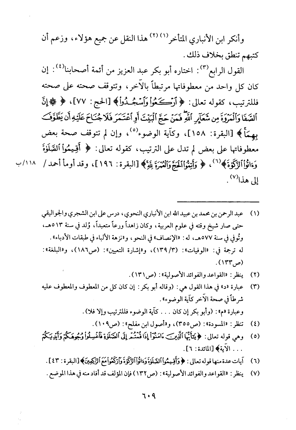 القَوْل الرَّابِع: اخْتَارَهُ أَبُو بكر عبد الْعَزِيز من أَئِمَّة أَصْحَابنَا: إِن كَانَ كل وَاحِد من معطوفاتها مرتبطاً بِالْآخرِ، وتتوقف صِحَّته على صِحَّته فللترتيب، كَقَوْلِه تَعَالَى: {ارْكَعُوا واسجدوا} [الْحَج: ٧٧] ، {إِن الصَّفَا والمروة من شَعَائِر الله فَمن حج الْبَيْت أَو اعْتَمر فَلَا جنَاح عَلَيْهِ أَن يطوف بهما} [الْبَقَرَة: ١٥٨] ، وكآية الْوضُوء، وَإِن لم تتَوَقَّف صِحَة بعض معطوفاتها على بعض لم تدل على التَّرْتِيب، كَقَوْلِه تَعَالَى: {أقِيمُوا الصَّلَاة وءاتوا الزَّكَاة} ، {وَأَتمُّوا الْحَج وَالْعمْرَة لله} [الْبَقَرَة: ١٩٦] ، وَقد أَوْمَأ أَحْمد / إِلَى هَذَا.