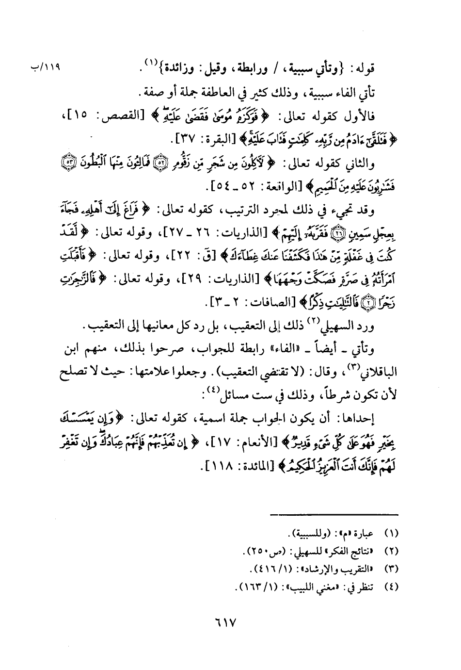 وَقد تَجِيء فِي ذَلِك لمُجَرّد التَّرْتِيب، كَقَوْلِه تَعَالَى: {فرَاغ إِلَى أَهله فجَاء بعجل سمين فقربه إِلَيْهِم} [الذاريات: ٢٦ - ٢٧] ، وَقَوله تَعَالَى: {لقد كنت فِي غَفلَة من هَذَا فكشفنا عَنْك غطاءك} [ق: ٢٢] ، وَقَوله تَعَالَى: {فَأَقْبَلت امْرَأَته فِي صرة فصكت وَجههَا} [الذاريات: ٢٩] ، وَقَوله تَعَالَى: {فالزاجرات زجرا فالتاليات ذكرا} [الصافات: ٢ - ٣] .