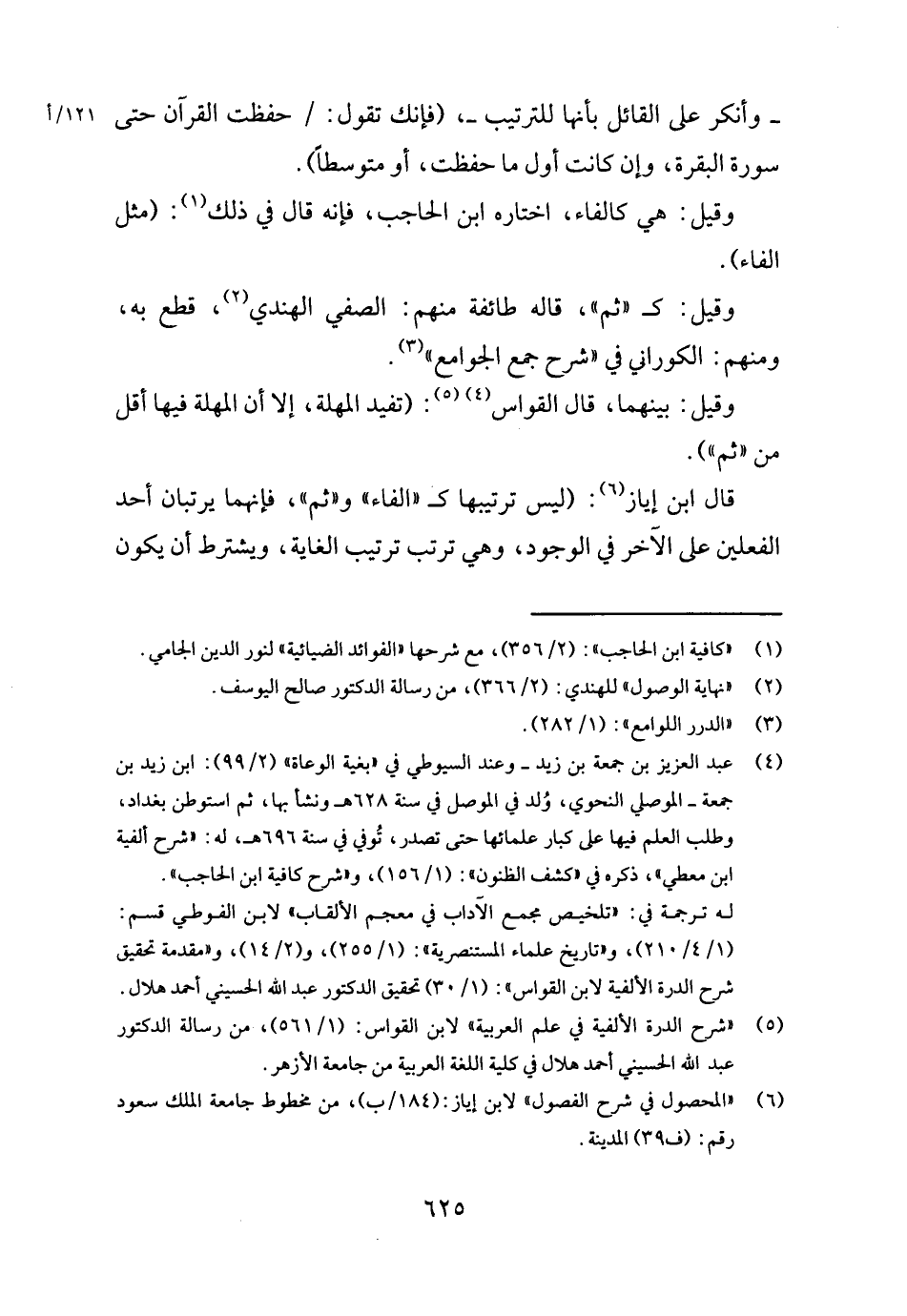 - وَأنكر على الْقَائِل بِأَنَّهَا للتَّرْتِيب -، (فَإنَّك تَقول: / حفظت الْقُرْآن حَتَّى سُورَة الْبَقَرَة، وَإِن كَانَت أول مَا حفظت، أَو متوسطاً) .