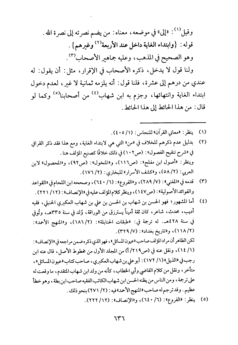 وَلنَا قَول لَا يدْخل، ذكره الْأَصْحَاب فِي الْإِقْرَار، مثل: أَن يَقُول: لَهُ عِنْدِي من دِرْهَم إِلَى عشرَة، فلنا قَول: أَنه يلْزمه ثَمَانِيَة لَا غير، لعدم دُخُول ابْتِدَاء الْغَايَة وانتهائها، وَجزم بِهِ ابْن شهَاب من أَصْحَابنَا وكما لَو قَالَ: من هَذَا الْحَائِط إِلَى هَذَا الْحَائِط.