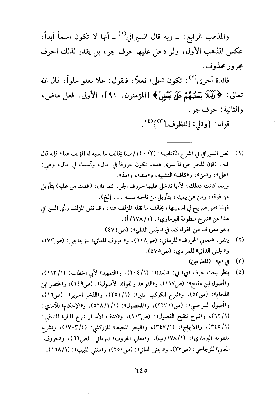 وَالْمذهب الرَّابِع: - وَبِه قَالَ السيرافي أَنَّهَا لَا تكون اسْما أبدا، عكس الْمَذْهَب الأول، وَلَو دخل عَلَيْهَا حرف جر، بل يقدر لذَلِك الْحَرْف مجرور مَحْذُوف.