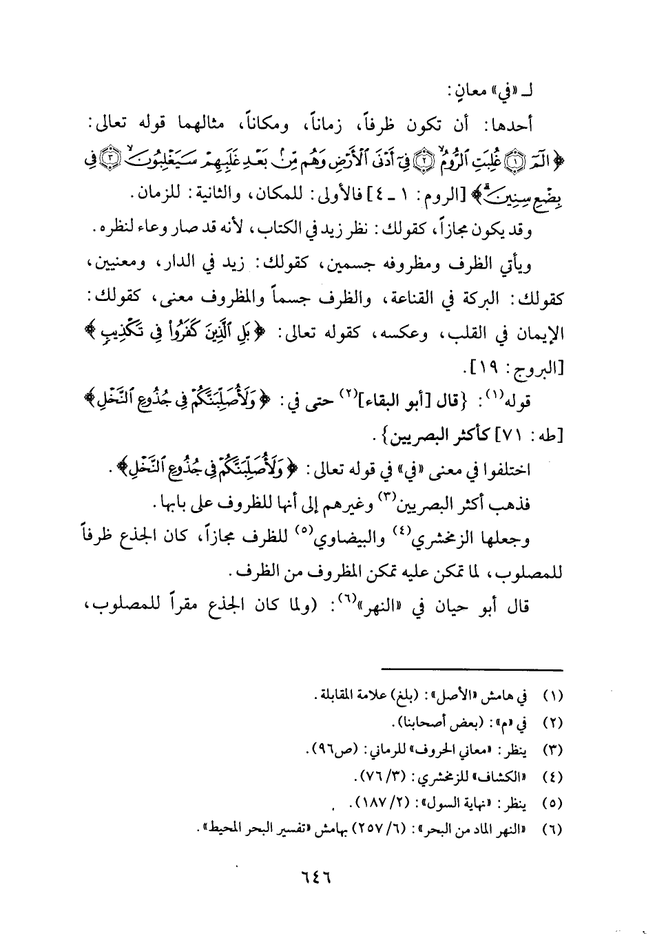 قَوْله: {قَالَ [أَبُو الْبَقَاء] حَتَّى فِي: {ولأصلبنكم فِي جُذُوع النّخل} [طه: ٧١] كأكثر الْبَصرِيين} .