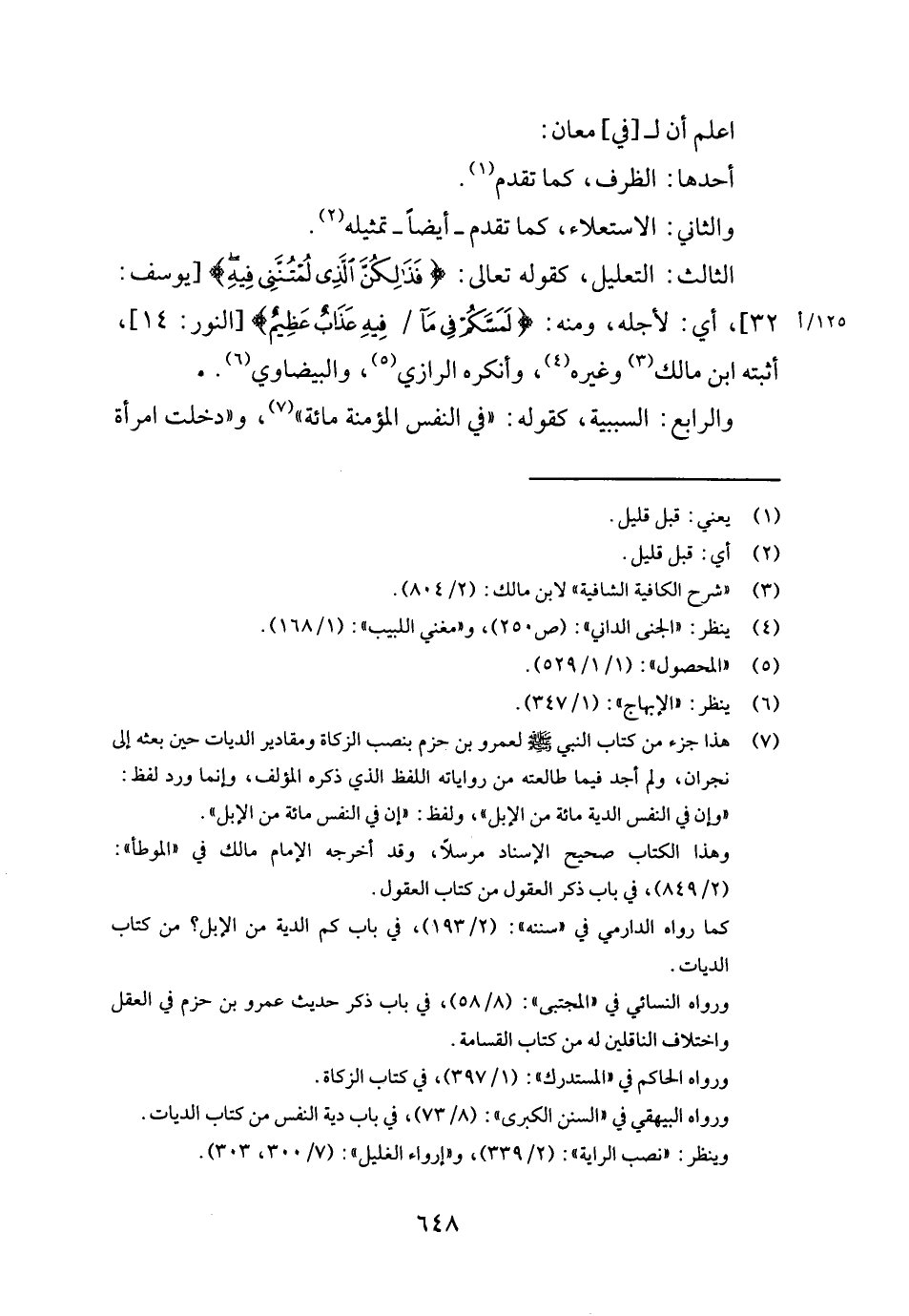 وَالرَّابِع: السَّبَبِيَّة، كَقَوْلِه: " فِي النَّفس المؤمنة مائَة "، و " دخلت امْرَأَة