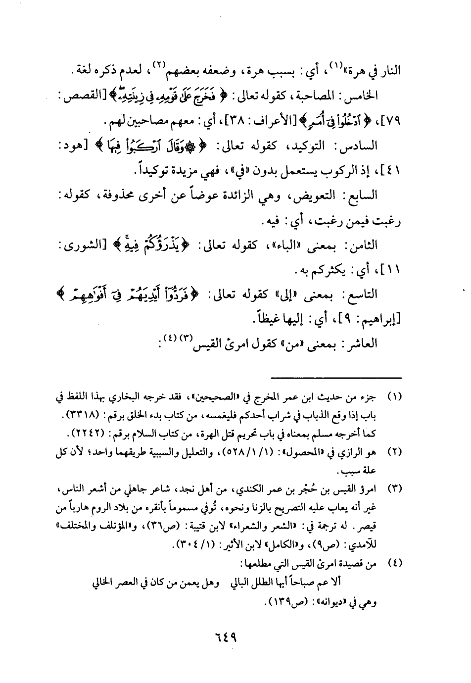 الثَّامِن: بِمَعْنى " الْبَاء "، كَقَوْلِه تَعَالَى: {يذرؤكم فِيهِ} [الشورى: ١١] ، أَي: يكثركم بِهِ.
