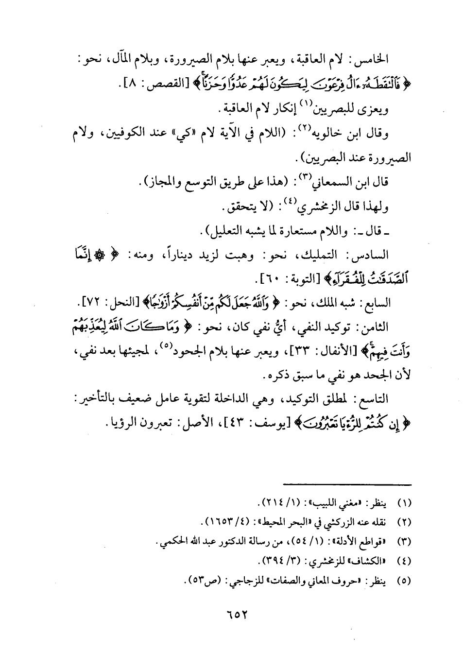 الْخَامِس: لَام الْعَاقِبَة، ويعبر عَنْهَا بلام الصيرورة، وبلام الْمَآل، نَحْو: {فالتقطه أل فِرْعَوْن ليَكُون لَهُم عدوا وحزنا} [الْقَصَص: ٨] .