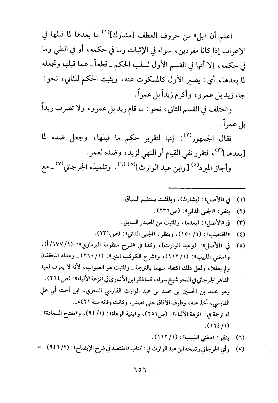اعْلَم أَن " بل " من حُرُوف الْعَطف [مشارك] مَا بعْدهَا لما قبلهَا فِي الْإِعْرَاب إِذا كَانَا مفردين، سَوَاء فِي الْإِثْبَات وَمَا فِي حكمه، أَو فِي النَّفْي وَمَا فِي حكمه، إِلَّا أَنَّهَا فِي الْقسم الأول لسلب الحكم - قطعا عَمَّا قبلهَا وتجعله لما بعْدهَا، أَي: يصير الأول كالمسكوت عَنهُ، وَيثبت الحكم للثَّانِي، نَحْو: جَاءَ زيد بل عَمْرو، وَأكْرم زيدا بل عمرا.