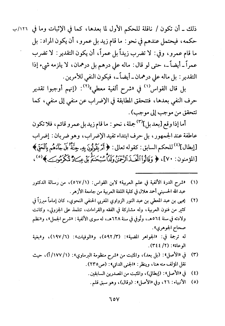 بل قَالَ القواس فِي " شرح ألفية معطي ": (إِنَّهُم أوجبوا تَقْدِير حرف النَّفْي بعْدهَا، فتحقق الْمُطَابقَة فِي الإضراب عَن منفي إِلَى منفي، كَمَا تتَحَقَّق من مُوجب إِلَى مُوجب) .