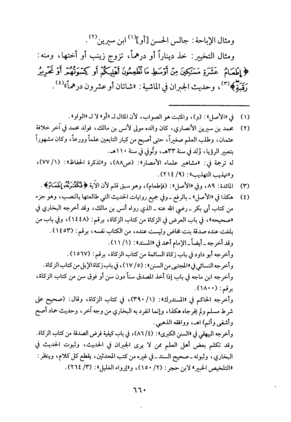 وَمِثَال التَّخْيِير: خُذ دِينَارا أَو درهما، تزوج زَيْنَب أَو أُخْتهَا، وَمِنْه: {إطْعَام عشرَة مَسَاكِين من أَوسط مَا تطْعمُونَ أهليكم أَو كسوتهم أَو تَحْرِير رَقَبَة} ، وَحَدِيث الْجبرَان فِي الْمَاشِيَة: " شَاتَان أَو عشرُون درهما ".