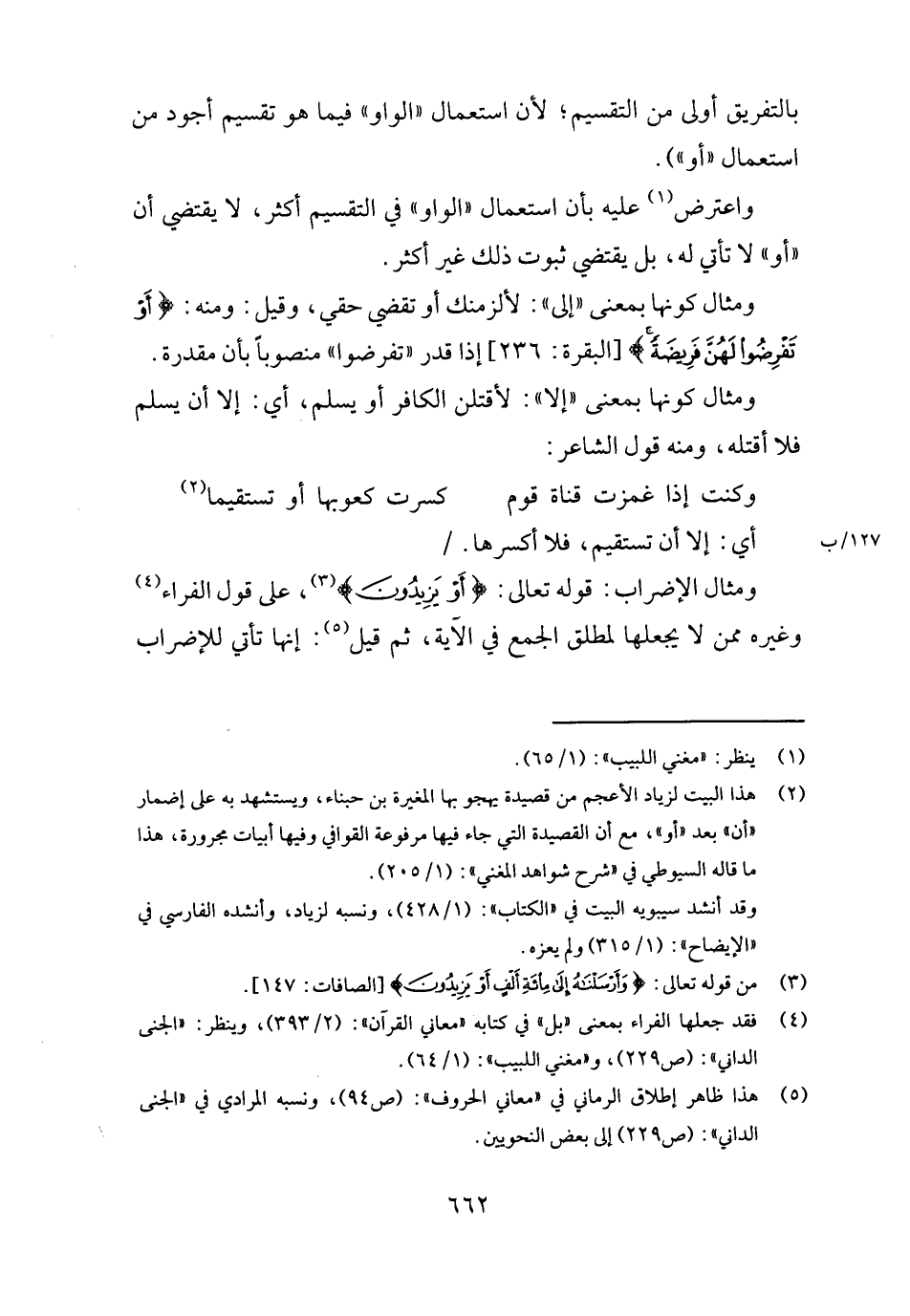 وَمِثَال الإضراب: قَوْله تَعَالَى: {أَو يزِيدُونَ} ، على قَول الْفراء وَغَيره مِمَّن لَا يَجْعَلهَا لمُطلق الْجمع فِي الْآيَة، ثمَّ قيل: إِنَّهَا تَأتي للإضراب