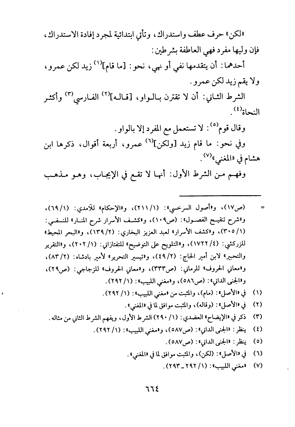 أَحدهمَا: أَن يتقدمها نفي أَو نهي، نَحْو: [مَا قَامَ] زيد لَكِن عَمْرو، وَلَا يقم زيد لَكِن عَمْرو. الشَّرْط الثَّانِي: أَن لَا تقترن بِالْوَاو، [قَالَه] الْفَارِسِي وَأكْثر النُّحَاة.