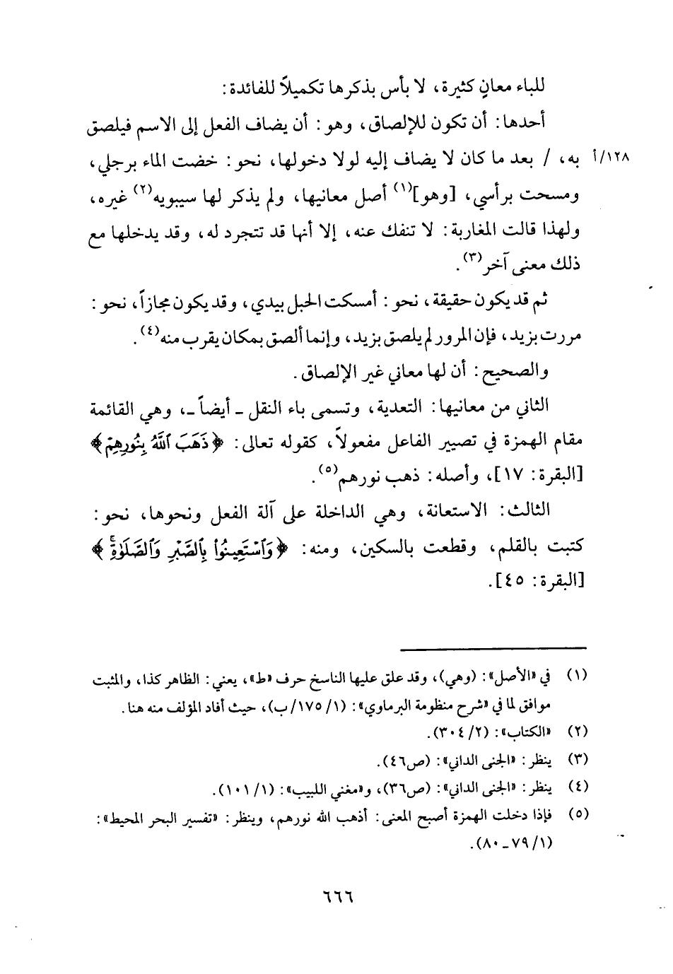 أَحدهَا: أَن تكون للإلصاق، وَهُوَ: أَن يُضَاف الْفِعْل إِلَى الِاسْم فيلصق بِهِ، بعد مَا كَانَ لَا يُضَاف إِلَيْهِ لَوْلَا دُخُولهَا، نَحْو: خضت المَاء برجلي، ومسحت برأسي، [وَهُوَ] أصل مَعَانِيهَا، وَلم يذكر لَهَا سِيبَوَيْهٍ غَيره، وَلِهَذَا قَالَت المغاربة: لَا تنفك عَنهُ، إِلَّا أَنَّهَا قد تتجرد لَهُ، وَقد يدخلهَا مَعَ ذَلِك معنى آخر.