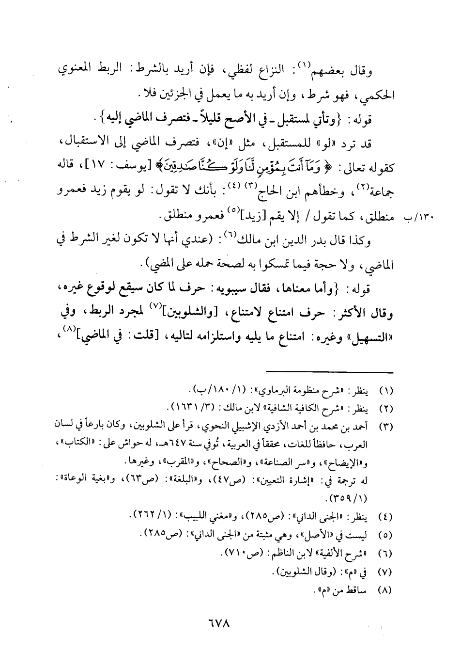 قَوْله: {وَأما مَعْنَاهَا، فَقَالَ سِيبَوَيْهٍ: حرف لما كَانَ سيقع لوُقُوع غَيره، وَقَالَ الْأَكْثَر: حرف امْتنَاع لِامْتِنَاع، [والشلوبين] لمُجَرّد الرَّبْط، وَفِي " التسهيل " وَغَيره: امْتنَاع مَا يَلِيهِ واستلزامه لتاليه، [قلت: فِي الْمَاضِي] ،