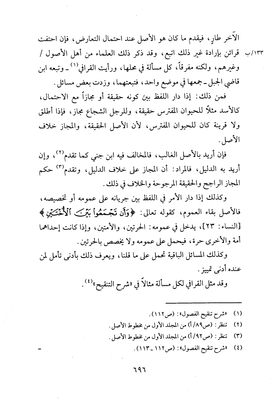 الآخر طَار، فَيقدم مَا كَانَ هُوَ الأَصْل عِنْد احْتِمَال التَّعَارُض، فَإِن احتفت قَرَائِن بِإِرَادَة غير ذَلِك اتبع، وَقد ذكر ذَلِك الْعلمَاء من أهل الْأُصُول وَغَيرهم، وَلكنه مفرقاً، كل مَسْأَلَة فِي محلهَا، وَرَأَيْت الْقَرَافِيّ تبعه ابْن قَاضِي الْجَبَل جمعهَا فِي مَوضِع وَاحِد، فتبعتهما، وزدت بعض مسَائِل.