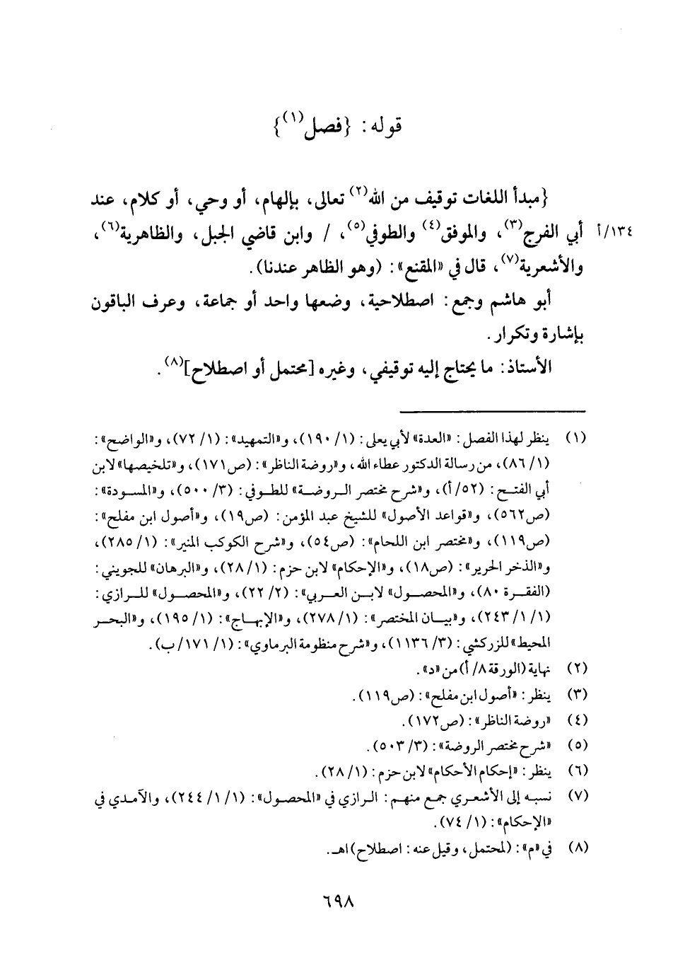 {مبدأ اللُّغَات تَوْقِيف من الله تَعَالَى، بإلهام، أَو وَحي، أَو كَلَام، عِنْد أبي الْفرج، والموفق والطوفي، وَابْن قَاضِي الْجَبَل، والظاهرية، والأشعرية، قَالَ فِي " الْمقنع ": (وَهُوَ الظَّاهِر عندنَا) .