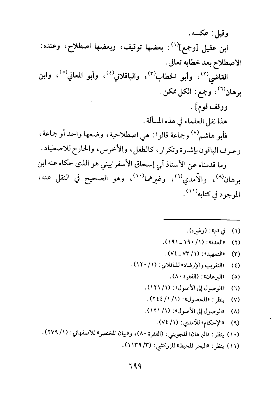 القَاضِي، وأبوالخطاب، والباقلاني، وَأَبُو الْمَعَالِي، وَابْن برهَان، وَجمع: الْكل مُمكن. ووقف قوم} .