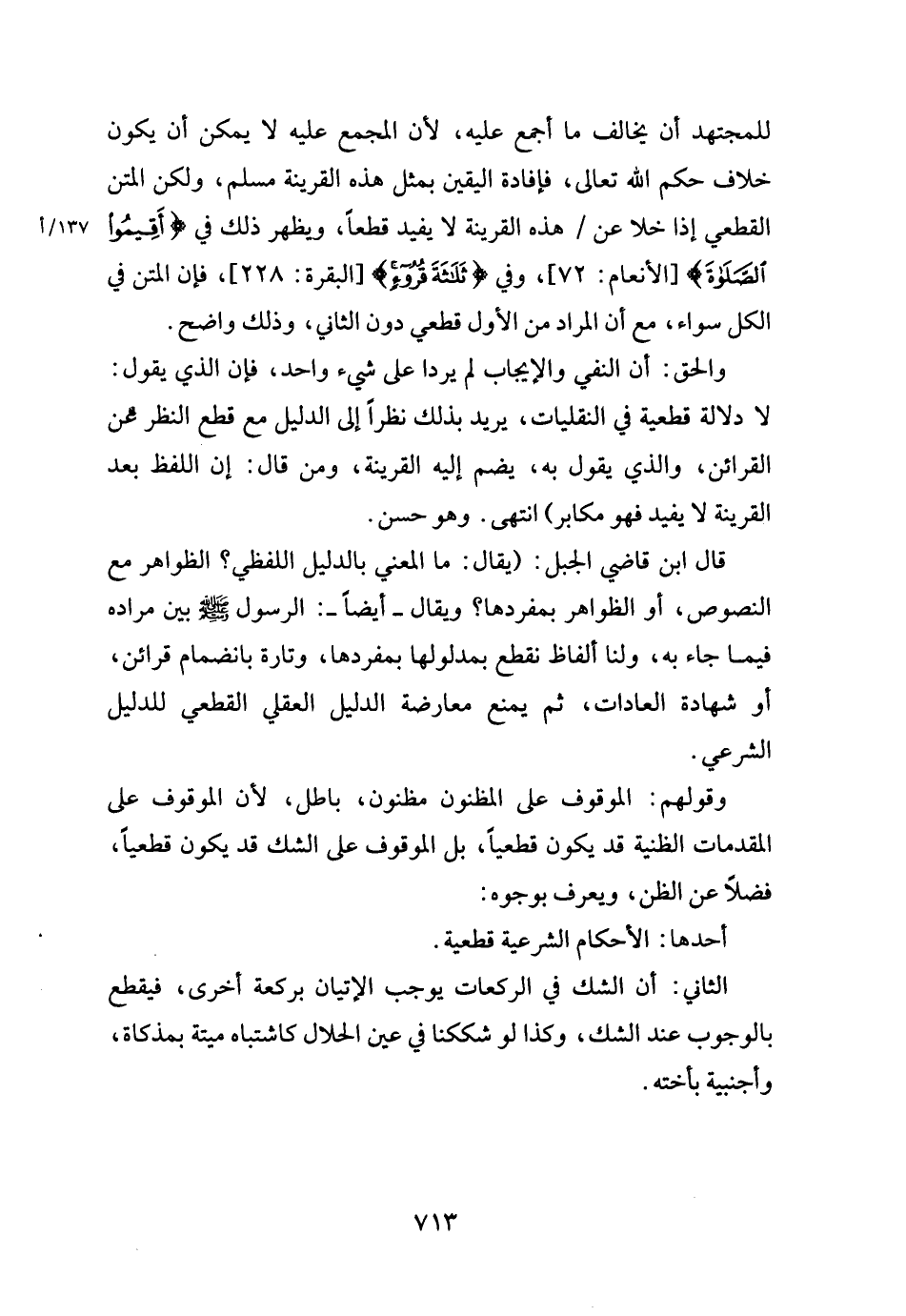 وَالْحق: أَن النَّفْي والإيجاب لم يردا على شَيْء وَاحِد، فَإِن الَّذِي يَقُول: لَا دلَالَة قَطْعِيَّة فِي النقليات، يُرِيد بذلك نظرا إِلَى الدَّلِيل مَعَ قطع النّظر عَن الْقَرَائِن، وَالَّذِي يَقُول بِهِ، يضم إِلَيْهِ الْقَرِينَة، وَمن قَالَ: " إِن اللَّفْظ بعد الْقَرِينَة لَا يُفِيد فَهُوَ مكابر) انْتهى. وَهُوَ حسن.