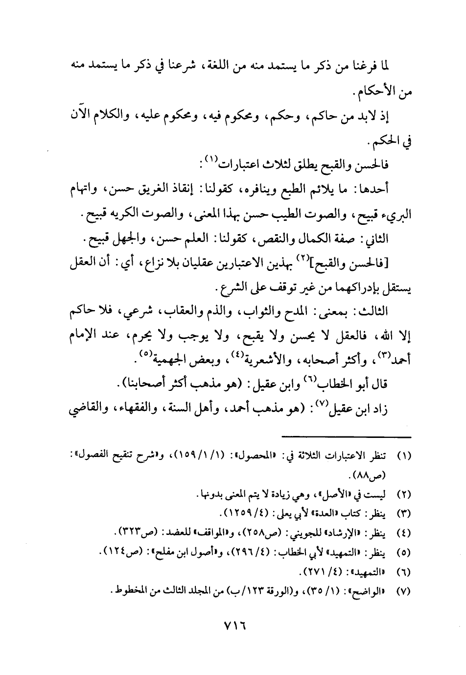 إِذْ لَا بُد من حَاكم، وَحكم، ومحكوم فِيهِ، ومحكوم عَلَيْهِ، وَالْكَلَام الْآن فِي الحكم. فالحسن والقبح يُطلق لثلاث اعتبارات: