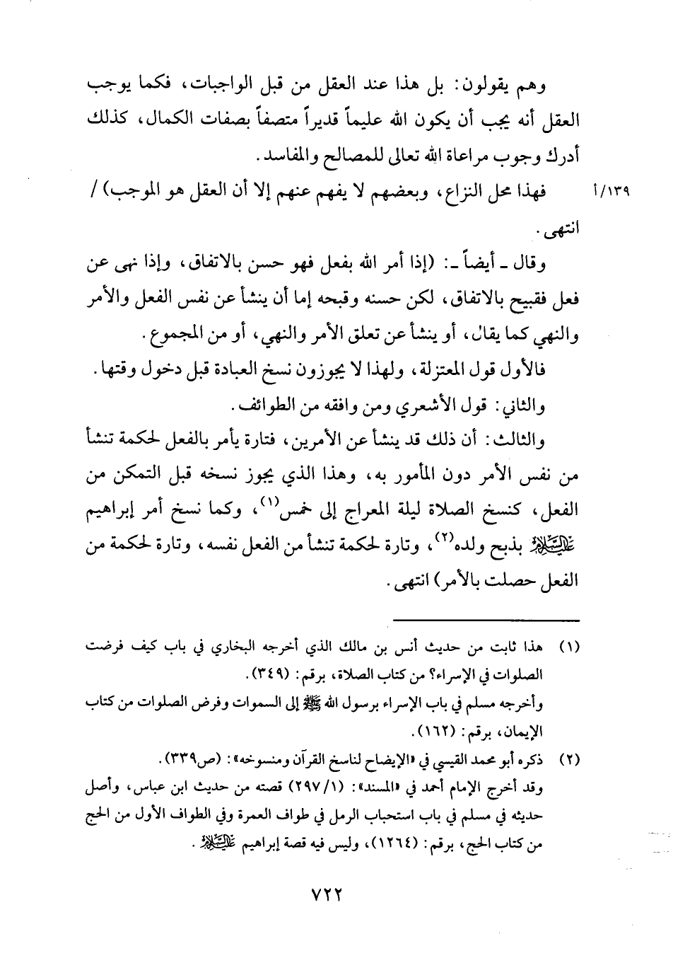 وَالثَّالِث: أَن ذَلِك قد ينشأ عَن الْأَمريْنِ، فَتَارَة يَأْمر بِالْفِعْلِ لحكمة تنشأ من نفس الْأَمر دون الْمَأْمُور بِهِ، وَهَذَا الَّذِي يجوز نسخه قبل التَّمَكُّن من الْفِعْل، كنسخ الصَّلَاة لَيْلَة الْمِعْرَاج إِلَى خمس، وكما نسخ أَمر إِبْرَاهِيم عَلَيْهِ السَّلَام بِذبح وَلَده، وَتارَة لحكمة تنشأ من الْفِعْل نَفسه، وَتارَة لحكمة من الْفِعْل حصلت بِالْأَمر) انْتهى.