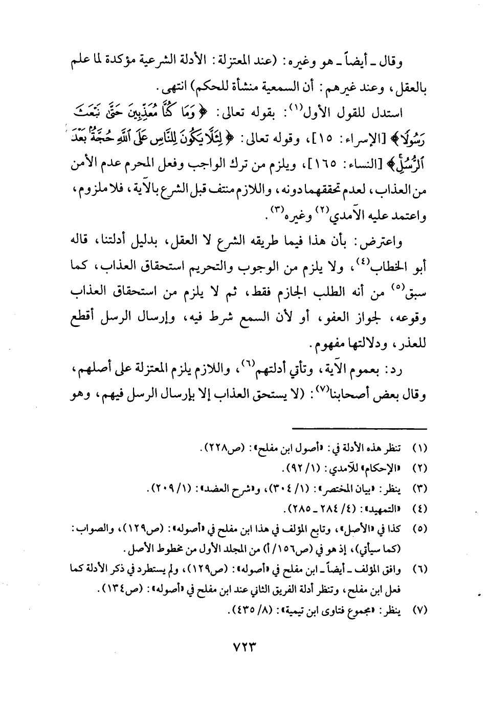 وَاعْترض: بِأَن هَذَا فِيمَا طَرِيقه الشَّرْع لَا الْعقل، بِدَلِيل أدلتنا، قَالَه أَبُو الْخطاب، وَلَا يلْزم من الْوُجُوب وَالتَّحْرِيم اسْتِحْقَاق الْعَذَاب، كَمَا سبق من أَنه الطّلب الْجَازِم فَقَط، ثمَّ لَا يلْزم من اسْتِحْقَاق الْعَذَاب وُقُوعه، لجَوَاز الْعَفو، أَو لِأَن السّمع شَرط فِيهِ، وإرسال الرُّسُل أقطع للْعُذْر، ودلالتها مَفْهُوم.