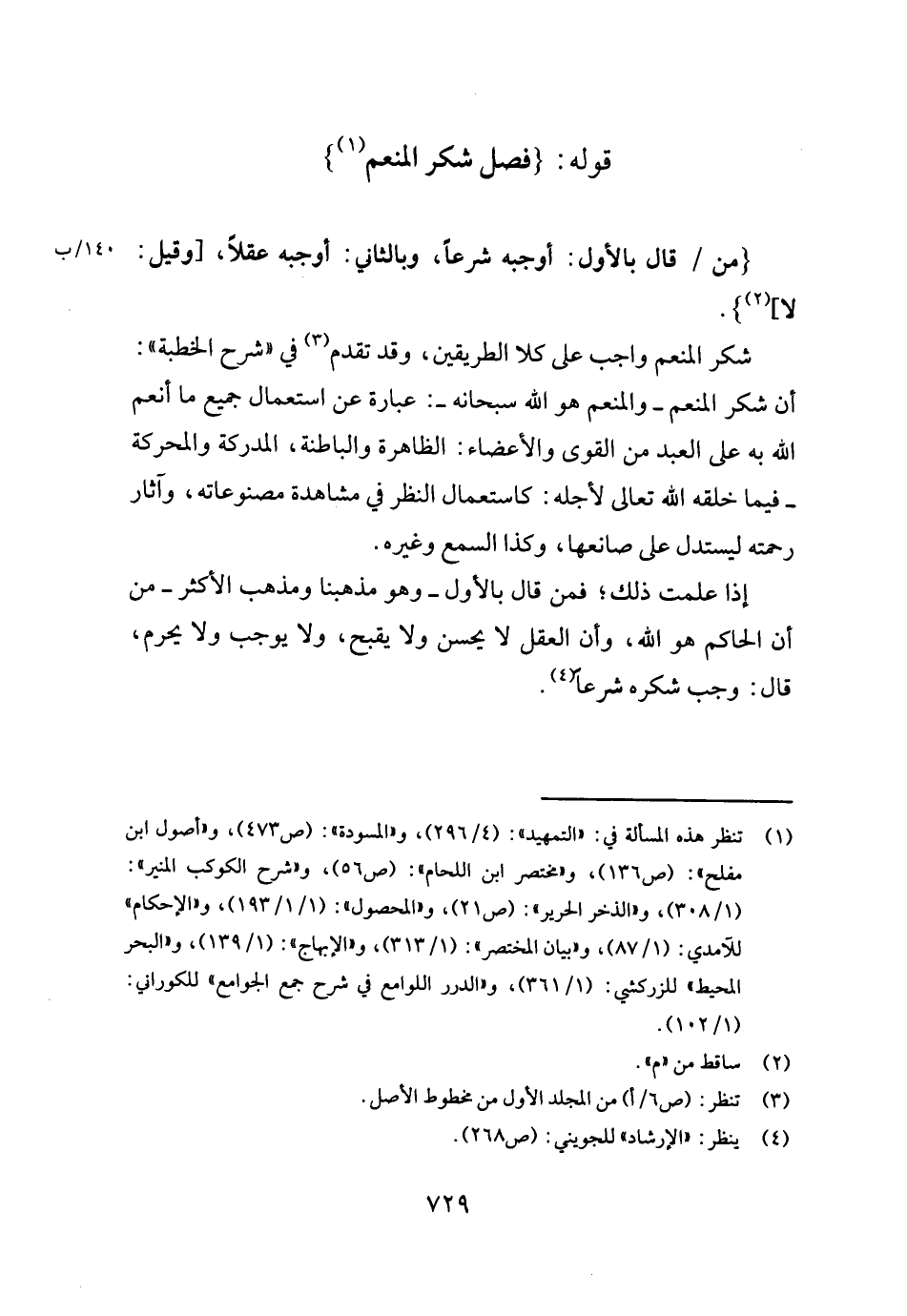 شكر الْمُنعم وَاجِب على كلا الطَّرِيقَيْنِ، وَقد تقدم فِي " شرح الْخطْبَة ": أَن شكر الْمُنعم والمنعم هُوَ الله سُبْحَانَهُ -: عبارَة عَن اسْتِعْمَال جَمِيع مَا أنعم الله بِهِ على العَبْد من القوى والأعضاء: الظَّاهِرَة والباطنة، المدركة والمحركة - فِيمَا خلقه الله تَعَالَى لأَجله: كاستعمال النّظر فِي مُشَاهدَة مصنوعاته، وآثار رَحمته ليستدل على صانعها، وَكَذَا السّمع وَغَيره.