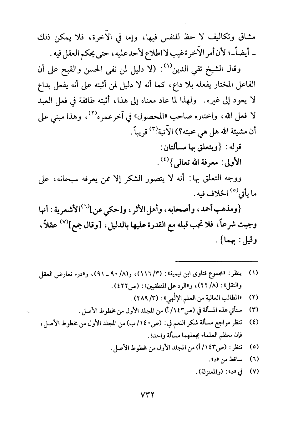 وَقَالَ الشَّيْخ تَقِيّ الدّين: (لَا دَلِيل لمن نفى الْحسن والقبح على أَن الْفَاعِل الْمُخْتَار يَفْعَله بِلَا دَاع، كَمَا أَنه لَا دَلِيل لمن أثْبته على أَنه يفعل بداع لَا يعود إِلَى غَيره. وَلِهَذَا لما عَاد مَعْنَاهُ إِلَى هَذَا، أثْبته طَائِفَة فِي فعل العَبْد لَا فعل الله، وَاخْتَارَهُ صَاحب " الْمَحْصُول " فِي آخر عمْرَة، وَهَذَا مَبْنِيّ على أَن مَشِيئَة الله هَل هِيَ محبته؟) الْآتِيَة قَرِيبا.