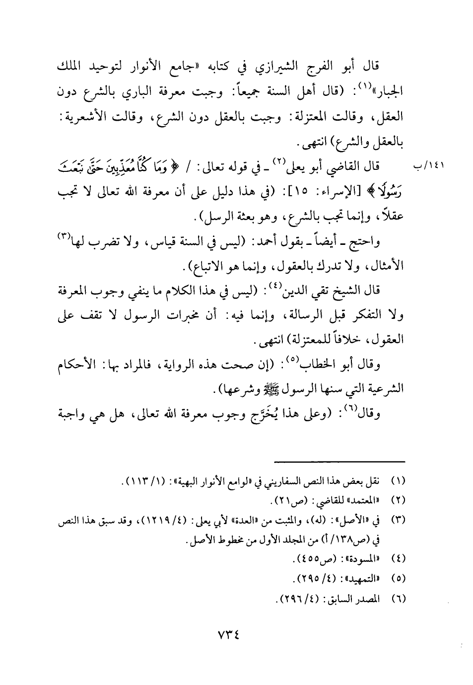 قَالَ أَبُو الْفرج الشِّيرَازِيّ فِي كِتَابه " جَامع الْأَنْوَار لتوحيد الْملك الْجَبَّار ": (قَالَ أهل السّنة جَمِيعًا: وَجَبت معرفَة الْبَارِي بِالشَّرْعِ دون الْعقل، وَقَالَت الْمُعْتَزلَة: وَجَبت بِالْعقلِ دون الشَّرْع، وَقَالَت الأشعرية: بِالْعقلِ وَالشَّرْع) انْتهى.