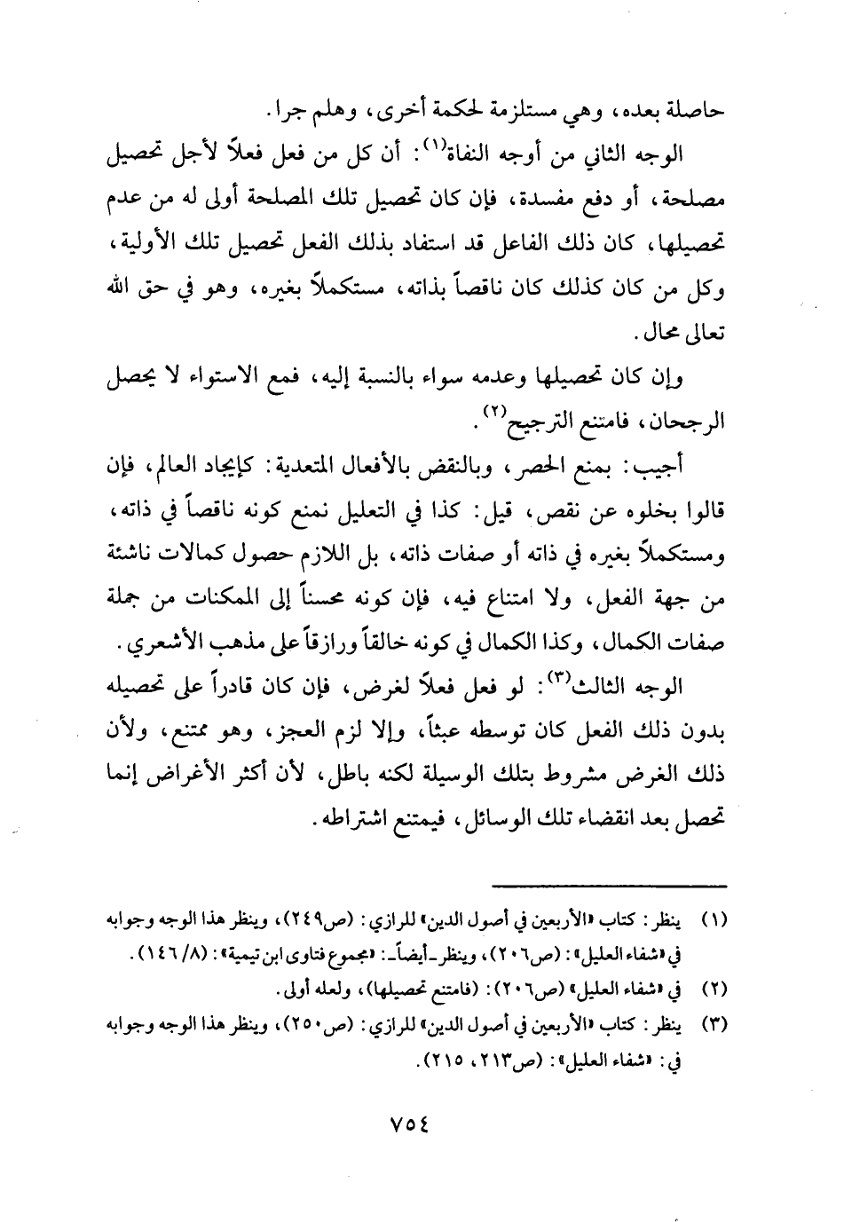 الْوَجْه الثَّانِي من أوجه النفاة: أَن كل من فعل فعلا لأجل تَحْصِيل مصلحَة، أَو دفع مفْسدَة، فَإِن كَانَ تَحْصِيل تِلْكَ الْمصلحَة أولى لَهُ من عدم تَحْصِيلهَا، كَانَ ذَلِك الْفَاعِل قد اسْتَفَادَ بذلك الْفِعْل تَحْصِيل تِلْكَ الأولية، وكل من كَانَ كَذَلِك كَانَ نَاقِصا بِذَاتِهِ، مستكملاً بِغَيْرِهِ، وَهُوَ فِي حق الله تَعَالَى محَال.