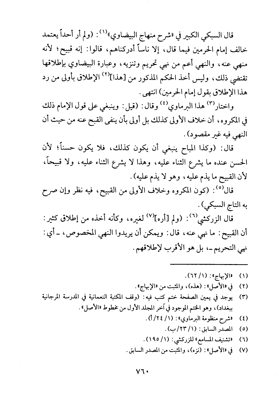 قَالَ السُّبْكِيّ الْكَبِير فِي " شرح منهاج الْبَيْضَاوِيّ ": (وَلم أر أحدا يعْتَمد خَالف إِمَام الْحَرَمَيْنِ فِيمَا قَالَ، إِلَّا نَاسا أدركناهم، قَالُوا: إِنَّه قَبِيح؛ لِأَنَّهُ مَنْهِيّ عَنهُ، وَالنَّهْي أَعم من نهي تَحْرِيم وتنزيه، وَعبارَة الْبَيْضَاوِيّ بإطلاقها تَقْتَضِي ذَلِك، وَلَيْسَ أَخذ الحكم الْمَذْكُور من [هَذَا] الْإِطْلَاق بِأولى من رد هَذَا الْإِطْلَاق بقول إِمَام الْحَرَمَيْنِ) انْتهى.