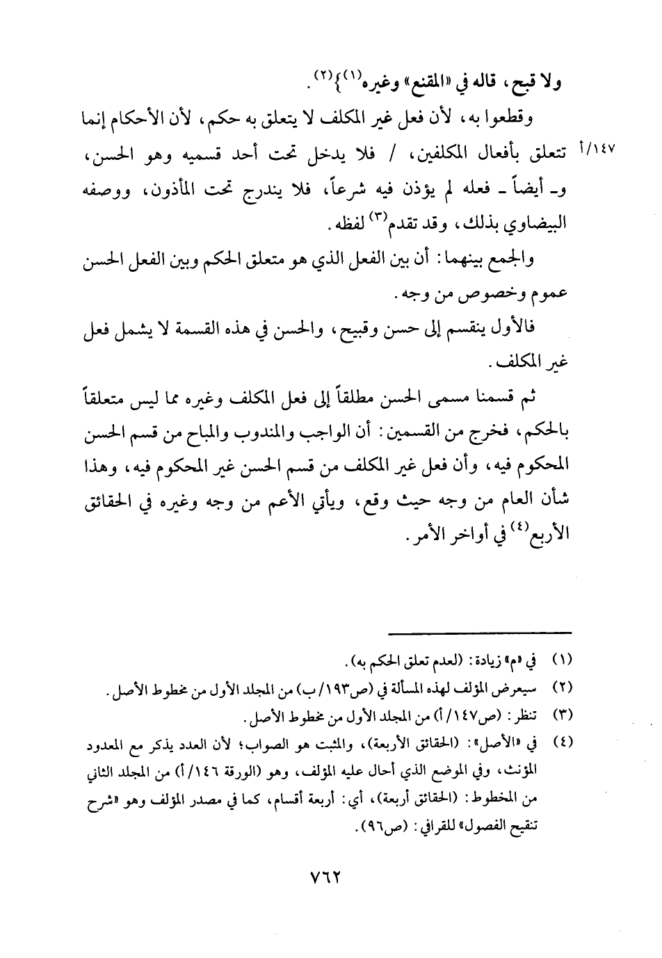 ثمَّ قسمنا مُسَمّى الْحسن مُطلقًا إِلَى فعل الْمُكَلف وَغَيره مِمَّا لَيْسَ مُتَعَلقا بالحكم، فَخرج من الْقسمَيْنِ: أَن الْوَاجِب وَالْمَنْدُوب والمباح من قسم الْحسن الْمَحْكُوم فِيهِ، وان فعل غير الْمُكَلف من قسم الْحسن غير الْمَحْكُوم فِيهِ، وَهَذَا شَأْن الْعَام من وَجه حَيْثُ وَقع، وَيَأْتِي الْأَعَمّ من وَجه وَغَيره فِي الْحَقَائِق الْأَرْبَع فِي أَوَاخِر الْأَمر.