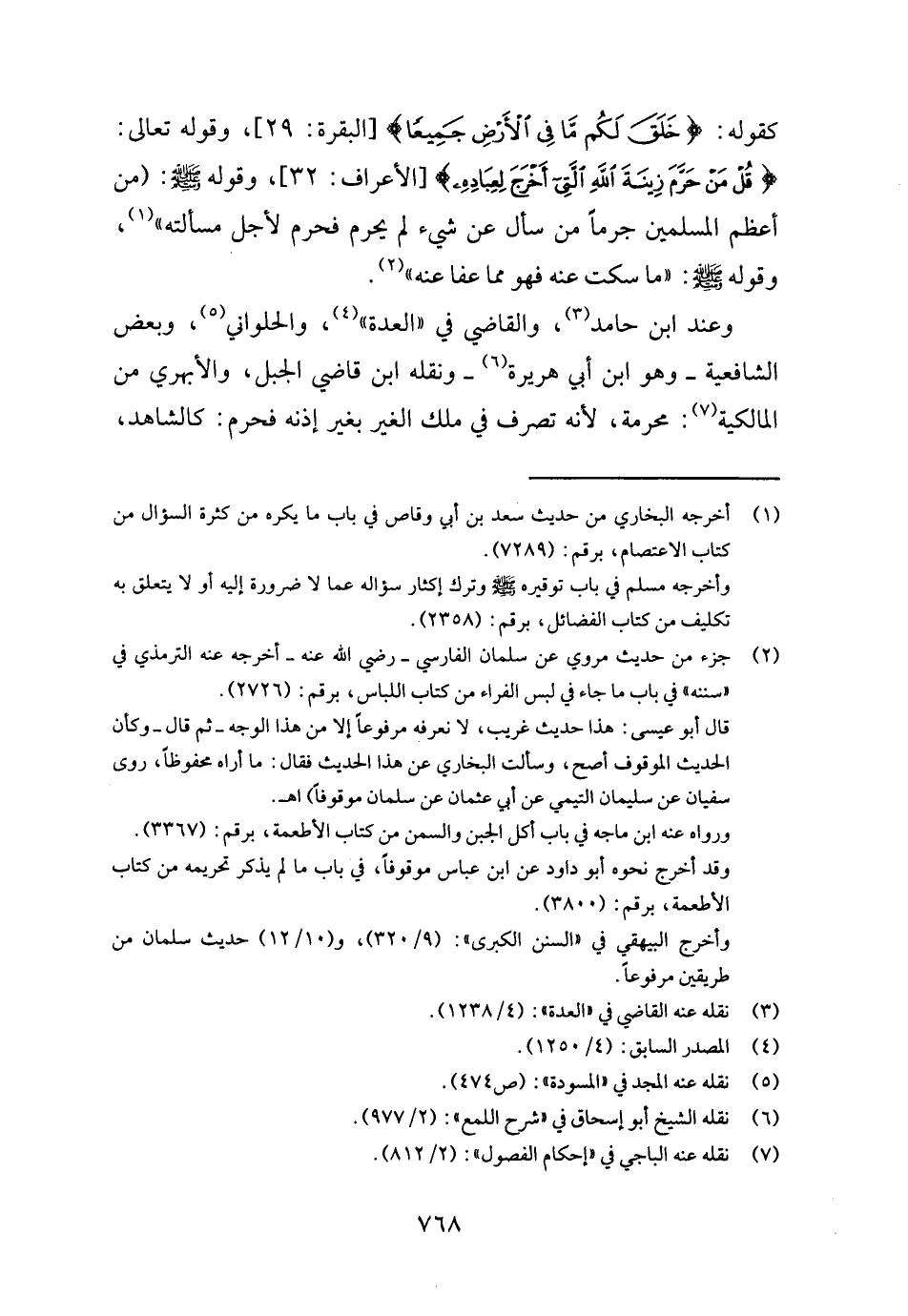 كَقَوْلِه: {خلق لكم مَا فِي الأَرْض جَمِيعًا} [الْبَقَرَة: ٢٩] ، وَقَوله تَعَالَى: {قل من حرم زِينَة الله الَّتِي أخرج لِعِبَادِهِ} [الْأَعْرَاف: ٣٢] ، وَقَوله - صَلَّى اللَّهُ عَلَيْهِ وَسَلَّم َ -: (من أعظم الْمُسلمين جرما من سَأَلَ عَن شَيْء لم يحرم محرملأجل مَسْأَلته ") ، وَقَوله - صَلَّى اللَّهُ عَلَيْهِ وَسَلَّم َ -: " مَا سكت عَنهُ فَهُوَ مِمَّا عَفا عَنهُ ".