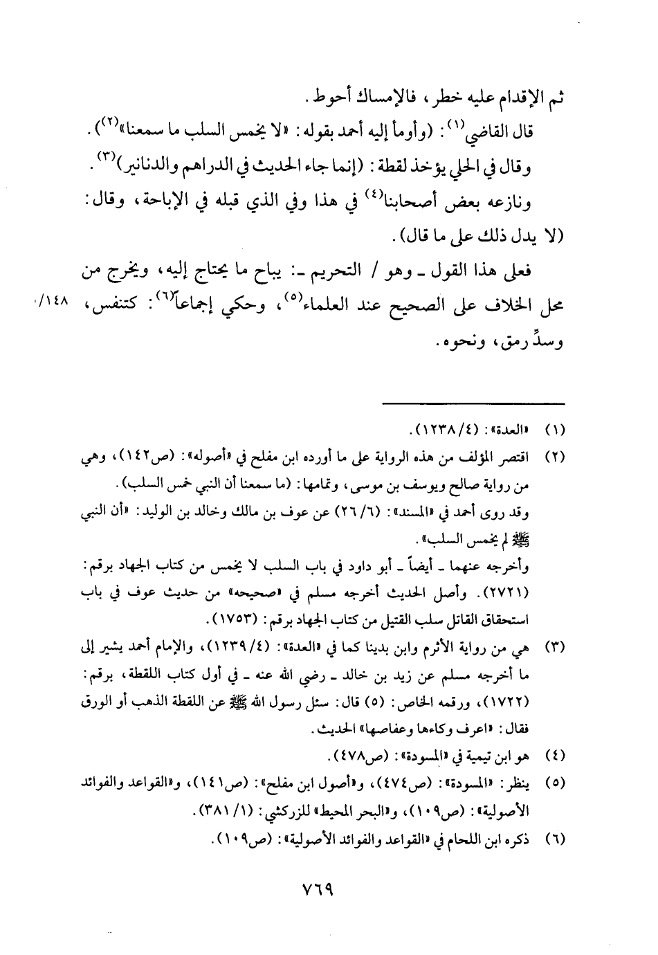 قَالَ القَاضِي: (وَأَوْمَأَ إِلَيْهِ أَحْمد بقوله: " لَا يُخَمّس السَّلب مَا سمعنَا ") وَقَالَ فِي الْحلِيّ يُؤْخَذ لقطَة: (إِنَّمَا جَاءَ الحَدِيث فِي الدَّرَاهِم وَالدَّنَانِير) .