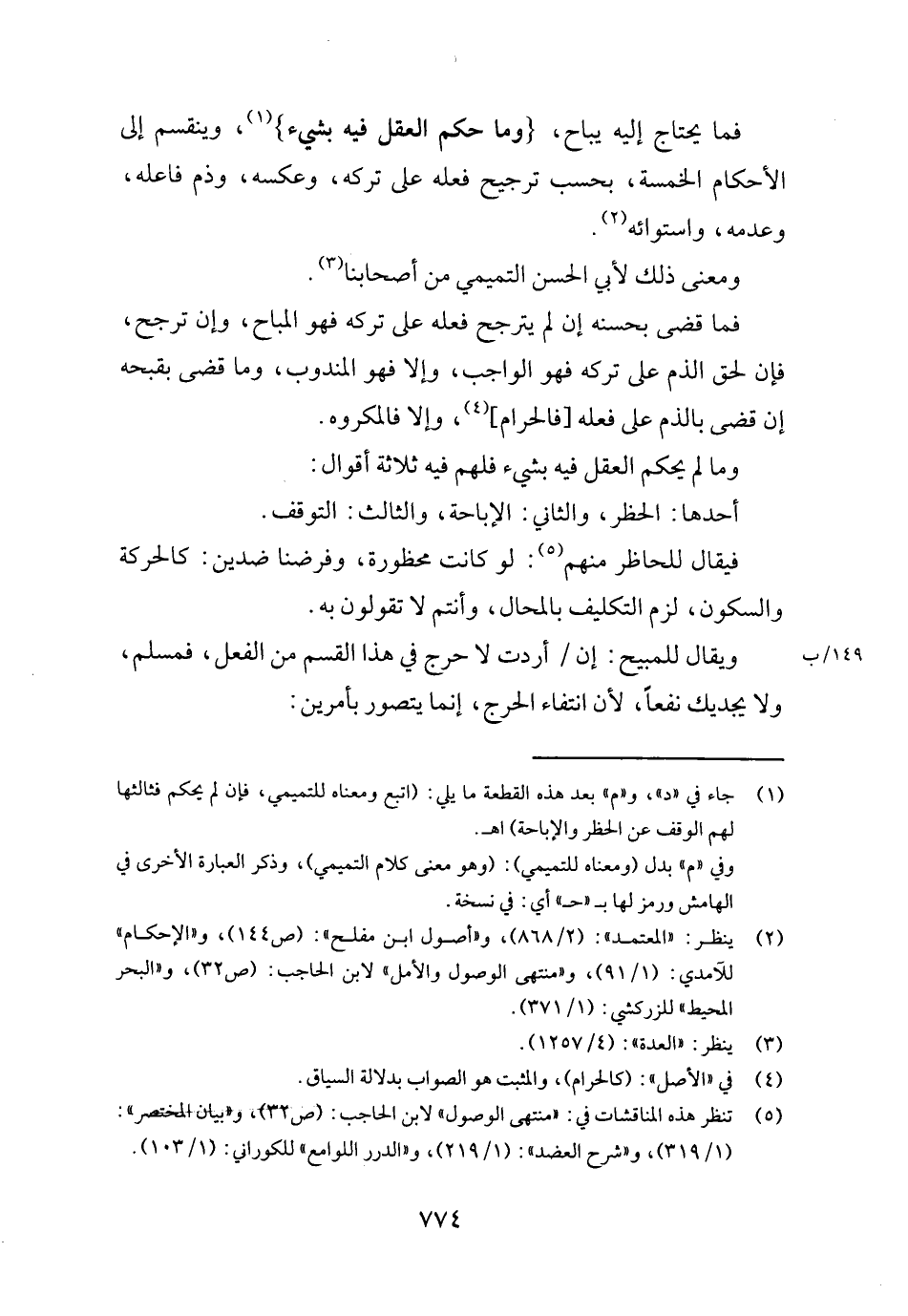 فَمَا يحْتَاج إِلَيْهِ يُبَاح، {وَمَا حكم الْعقل فِيهِ بِشَيْء} ، وينقسم إِلَى الْأَحْكَام الْخَمْسَة، بِحَسب تَرْجِيح فعله على تَركه، وَعَكسه، وذم فَاعله، وَعَدَمه، واستوائه.