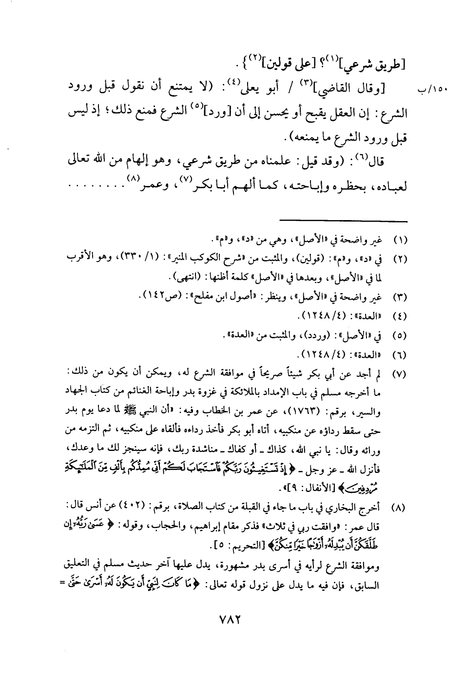 [وَقَالَ القَاضِي] أَبُو يعلى: (لَا يمْتَنع أَن نقُول قبل وُرُود الشَّرْع: إِن الْعقل يقبح أَو يحسن إِلَى أَن [ورد] الشَّرْع فَمنع ذَلِك؛ إِذْ لَيْسَ قبل وُرُود الشَّرْع مَا يمنعهُ) .