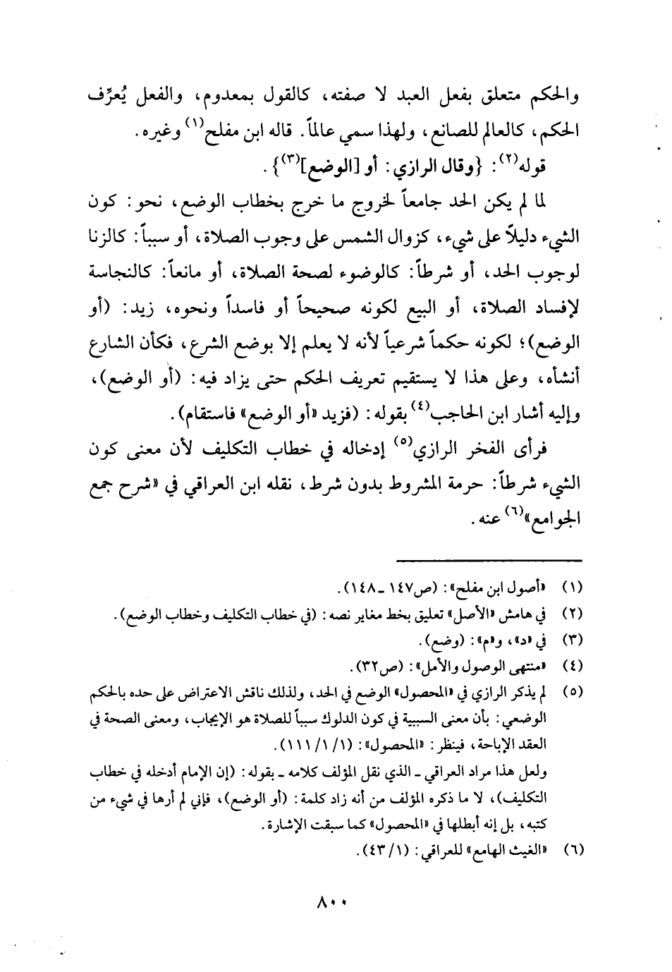 فَرَأى الْفَخر الرَّازِيّ إِدْخَاله فِي خطاب التَّكْلِيف لِأَن معنى كَون الشَّيْء شرطا: حُرْمَة الْمَشْرُوط بِدُونِ شَرط، نَقله ابْن الْعِرَاقِيّ فِي " شرح جمع الْجَوَامِع " عَنهُ.