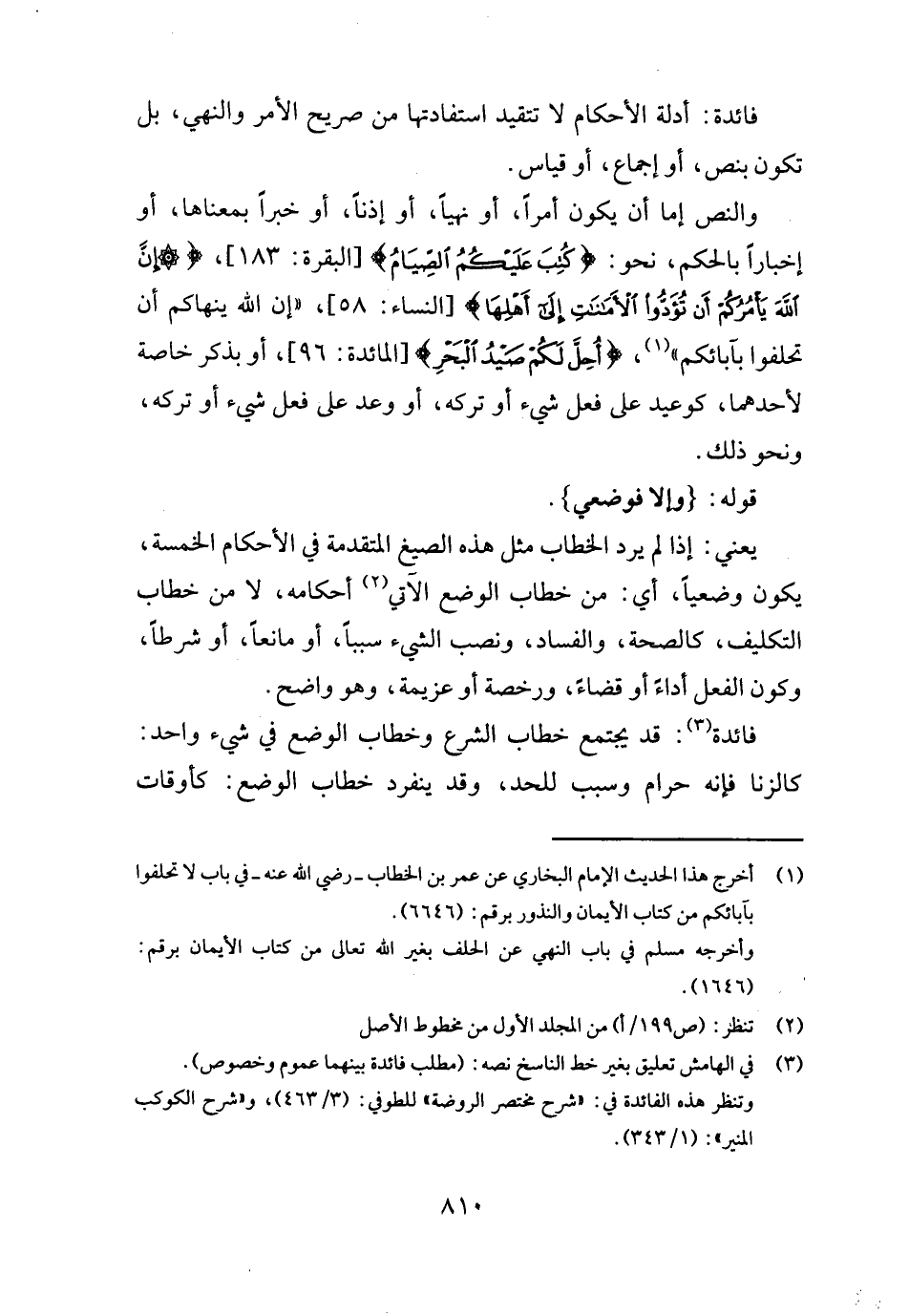 وَالنَّص إِمَّا أَن يكون أمرا، أَو نهيا، أَو إِذْنا، أَو خَبرا بمعناها، أَو إِخْبَارًا بالحكم، نَحْو: {كتب عَلَيْكُم الصّيام} [الْبَقَرَة: ١٨٣] ، {وَإِن الله يَأْمُركُمْ أَن تُؤَدُّوا الْأَمَانَات إِلَى أَهلهَا} [النِّسَاء: ٥٨] " إِ ن الله يَنْهَاكُم أَن تحلفُوا بِآبَائِكُمْ "، {أحل لكم صيد الْبَحْر} [الْمَائِدَة: ٩٦] ، أَو بِذكر خَاصَّة لأَحَدهمَا، كوعيد على فعل شَيْء أَو تَركه، أَو وعد على فعل شَيْء أَو تَركه، وَنَحْو ذَلِك.