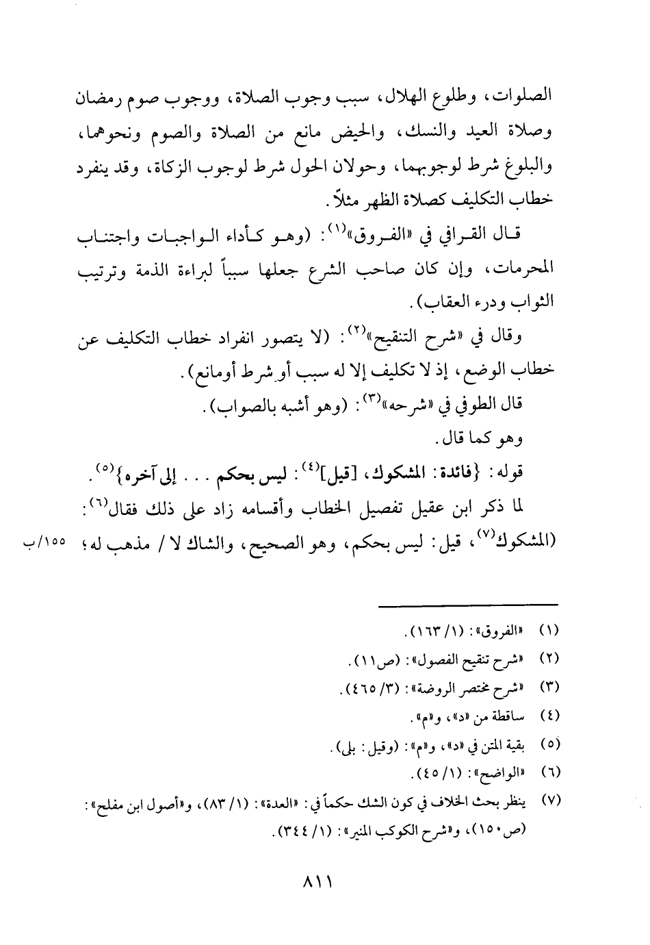 وَقَالَ فِي " شرح التَّنْقِيح ": (لَا يتَصَوَّر انْفِرَاد خطاب التَّكْلِيف عَن خطاب الْوَضع، إِذْ لَا تَكْلِيف إِلَّا لَهُ سَبَب أَو شَرط أَو مَانع) .