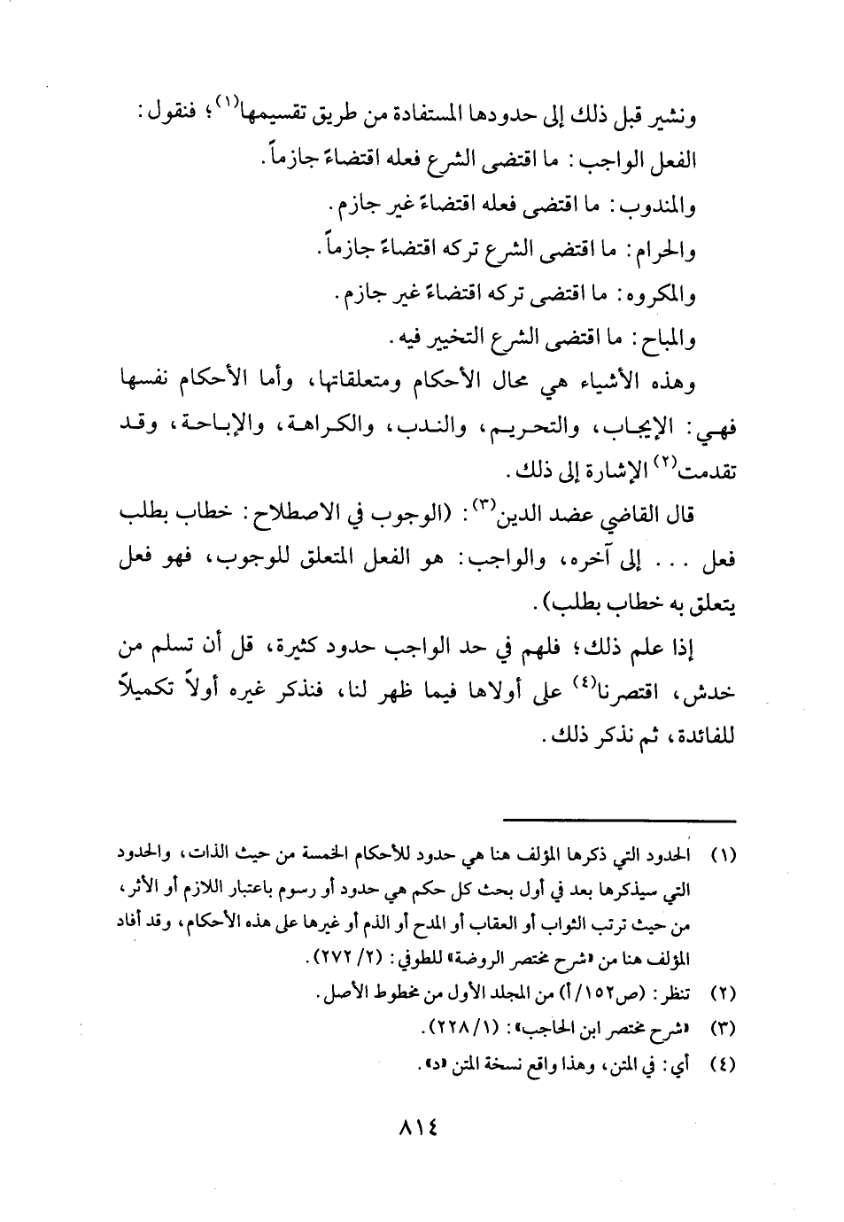 قَالَ القَاضِي عضد الدّين: (الْوُجُوب فِي الِاصْطِلَاح: خطاب بِطَلَب فعل ... . إِلَى آخِره، وَالْوَاجِب: هُوَ الْفِعْل الْمُتَعَلّق للْوُجُوب، فَهُوَ فعل يتَعَلَّق بِهِ خطاب بِطَلَب) .