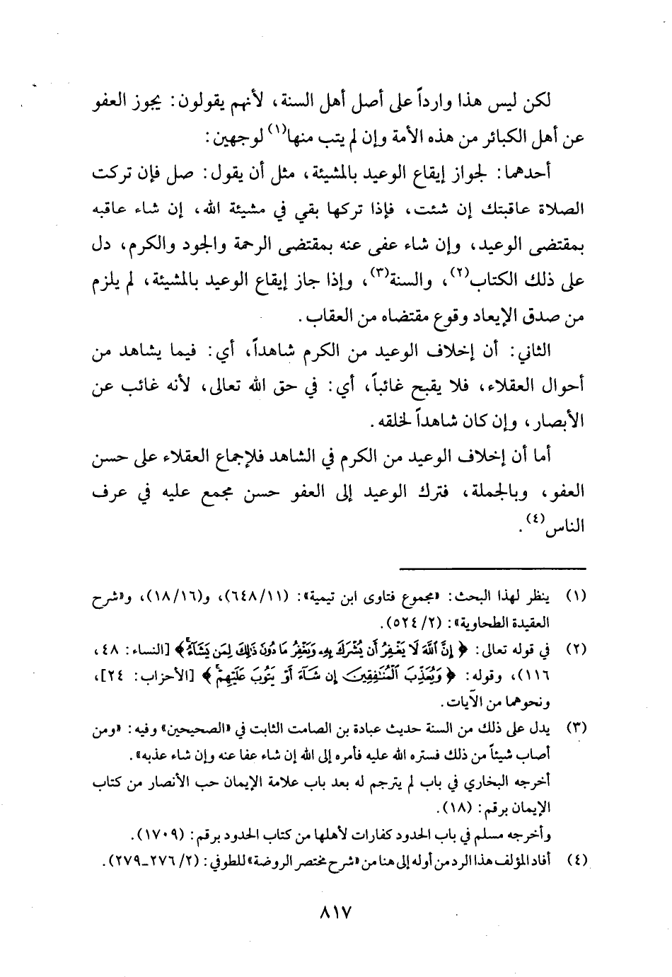 لَكِن لَيْسَ هَذَا وارداً على أصل أهل السّنة، لأَنهم يَقُولُونَ: يجوز الْعَفو عَن أهل الْكَبَائِر من هَذِه الْأمة وَإِن لم يتب مِنْهَا لوَجْهَيْنِ: