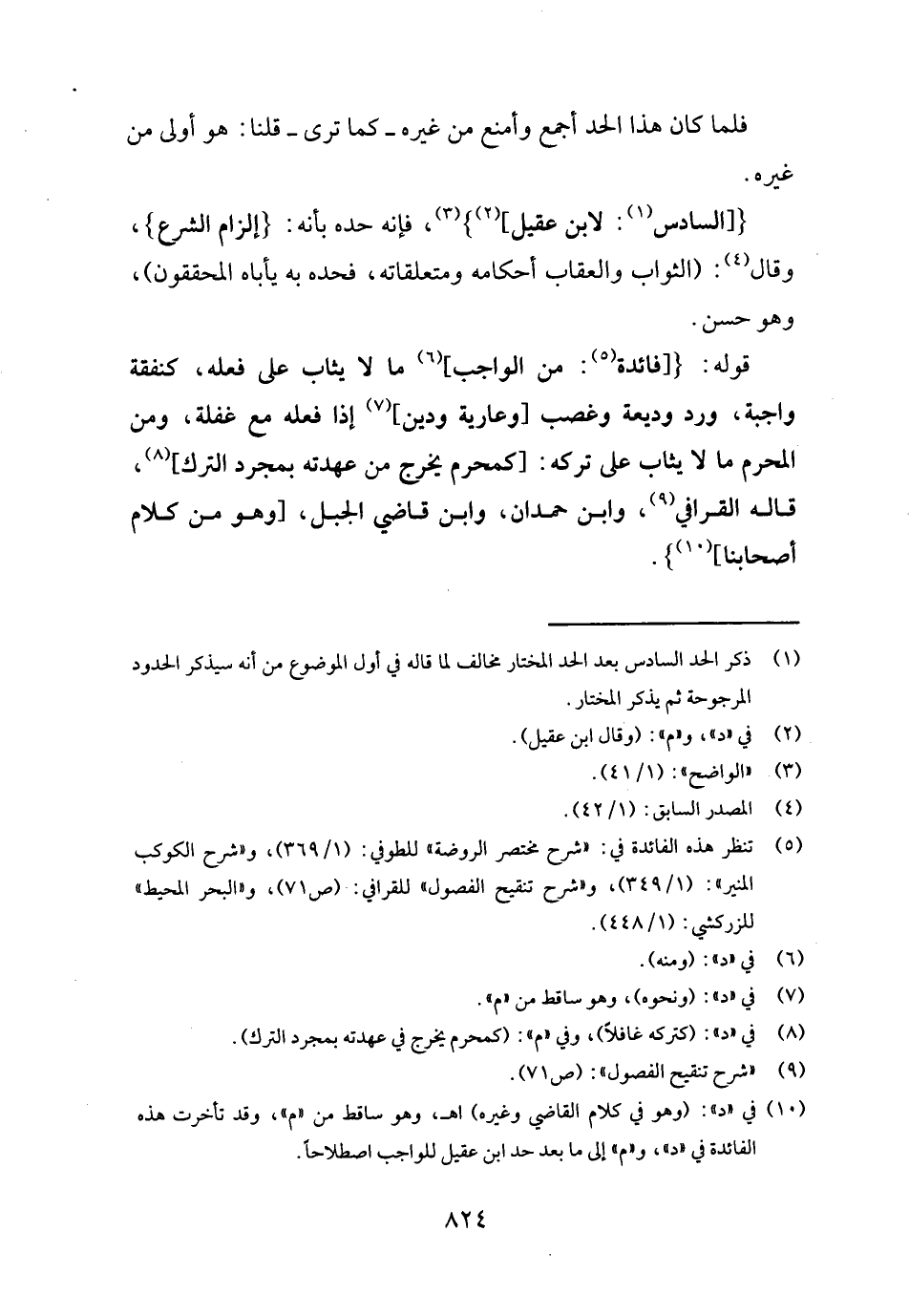 { [السَّادِس: لِابْنِ عقيل] } ، فَإِنَّهُ حَده بِأَنَّهُ: {إِلْزَام الشَّرْع} ، وَقَالَ: (الثَّوَاب وَالْعِقَاب أَحْكَامه ومتعلقاته، فحده بِهِ يأباه الْمُحَقِّقُونَ) ، وَهُوَ حسن.