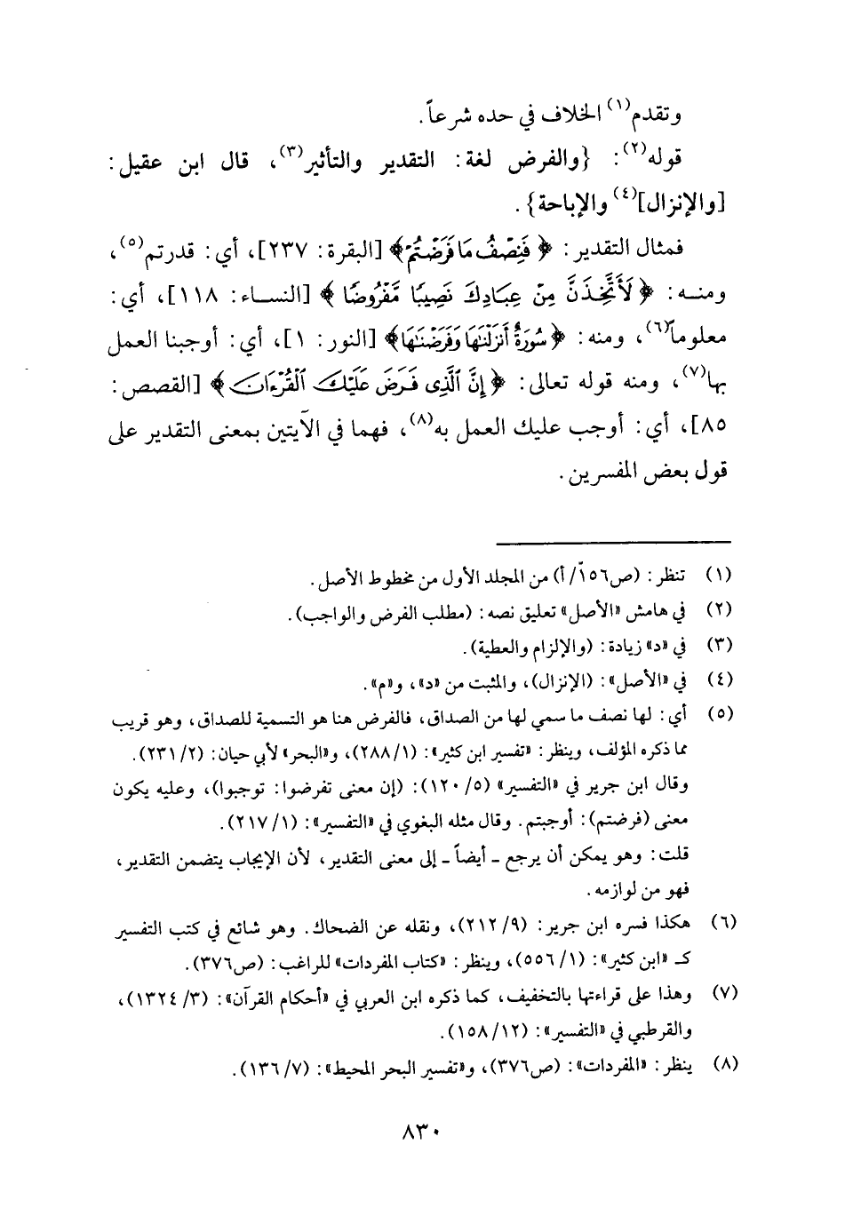 فمثال التَّقْدِير: {فَنصف مَا فرضتم} [الْبَقَرَة: ٢٣٧] ، أَي قدرتم، وَمِنْه: {لأتخذن من عِبَادك نَصِيبا مَفْرُوضًا} [النِّسَاء: ١١٨] ، أَي: مَعْلُوما، وَمِنْه: {سُورَة أنزلناها وفرضناها} [النُّور: ١] ، أَي: أَوجَبْنَا الْعَمَل بهَا، وَمِنْه قَوْله تَعَالَى: {إِن الَّذِي فرض عَلَيْك الْقُرْآن} [الْقَصَص: ٨٥] ، أَي: أوجب عَلَيْك الْعَمَل بِهِ، فهما فِي الْآيَتَيْنِ بِمَعْنى التَّقْدِير على قَول بعض الْمُفَسّرين.
