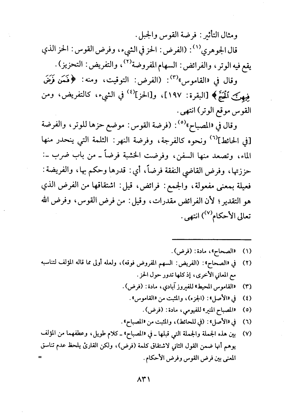 وَقَالَ فِي " الْقَامُوس ": (الْفَرْض: التَّوْقِيت، وَمِنْه: {فَمن فرض فِيهِنَّ الْحَج} [الْبَقَرَة: ١٩٧] ، و [الحز] فِي الشَّيْء كالتفريض، وَمن الْقوس موقع الْوتر) انْتهى.