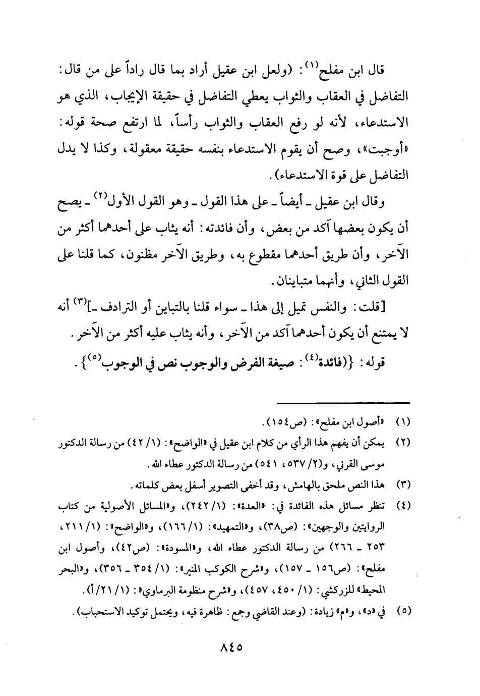 قَالَ ابْن مُفْلِح: (وَلَعَلَّ ابْن عقيل أَرَادَ بِمَا قَالَ راداً على من قَالَ: التَّفَاضُل فِي الْعقَاب وَالثَّوَاب يُعْطي التَّفَاضُل فِي حَقِيقَة الْإِيجَاب، الَّذِي هُوَ الاستدعاء، لِأَنَّهُ لَو رفع الْعقَاب وَالثَّوَاب رَأْسا، لما ارْتَفع صِحَة قَوْله: " أوجبت "، وَصَحَّ أَن يقوم الاستدعاء بِنَفسِهِ حَقِيقَة معقولة، وَكَذَا لَا يدل التَّفَاضُل على قُوَّة الاستدعاء) .