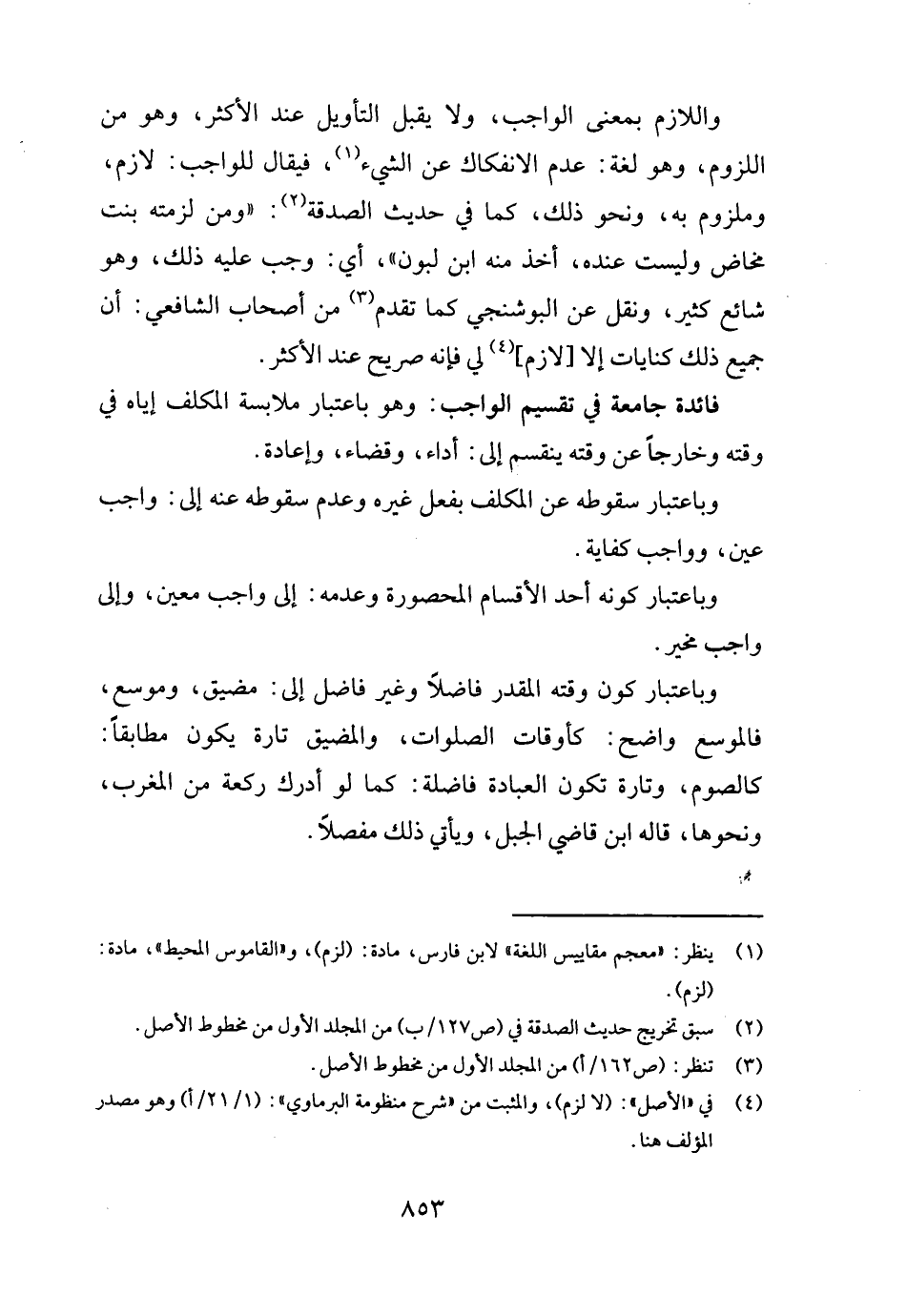 وَاللَّازِم بِمَعْنى الْوَاجِب، وَلَا يقبل التَّأْوِيل عِنْد الْأَكْثَر، وَهُوَ من اللُّزُوم، وَهُوَ لُغَة: عدم الانفكاك عَن الشَّيْء، فَيُقَال للْوَاجِب: لَازم، وملزوم بِهِ، وَنَحْو ذَلِك، كَمَا فِي حَدِيث الصَّدَقَة: " وَمن لَزِمته بنت مَخَاض وَلَيْسَت عِنْده، أَخذ مِنْهُ ابْن لبون "، أَي: وَجب عَلَيْهِ ذَلِك، وَهُوَ شَائِع كثير، وَنقل عَن البوشنجي كَمَا تقدم من أَصْحَاب الشَّافِعِي: أَن جَمِيع ذَلِك كنايات إِلَّا [لَازم] لي فَإِنَّهُ صَرِيح عِنْد الْأَكْثَر.