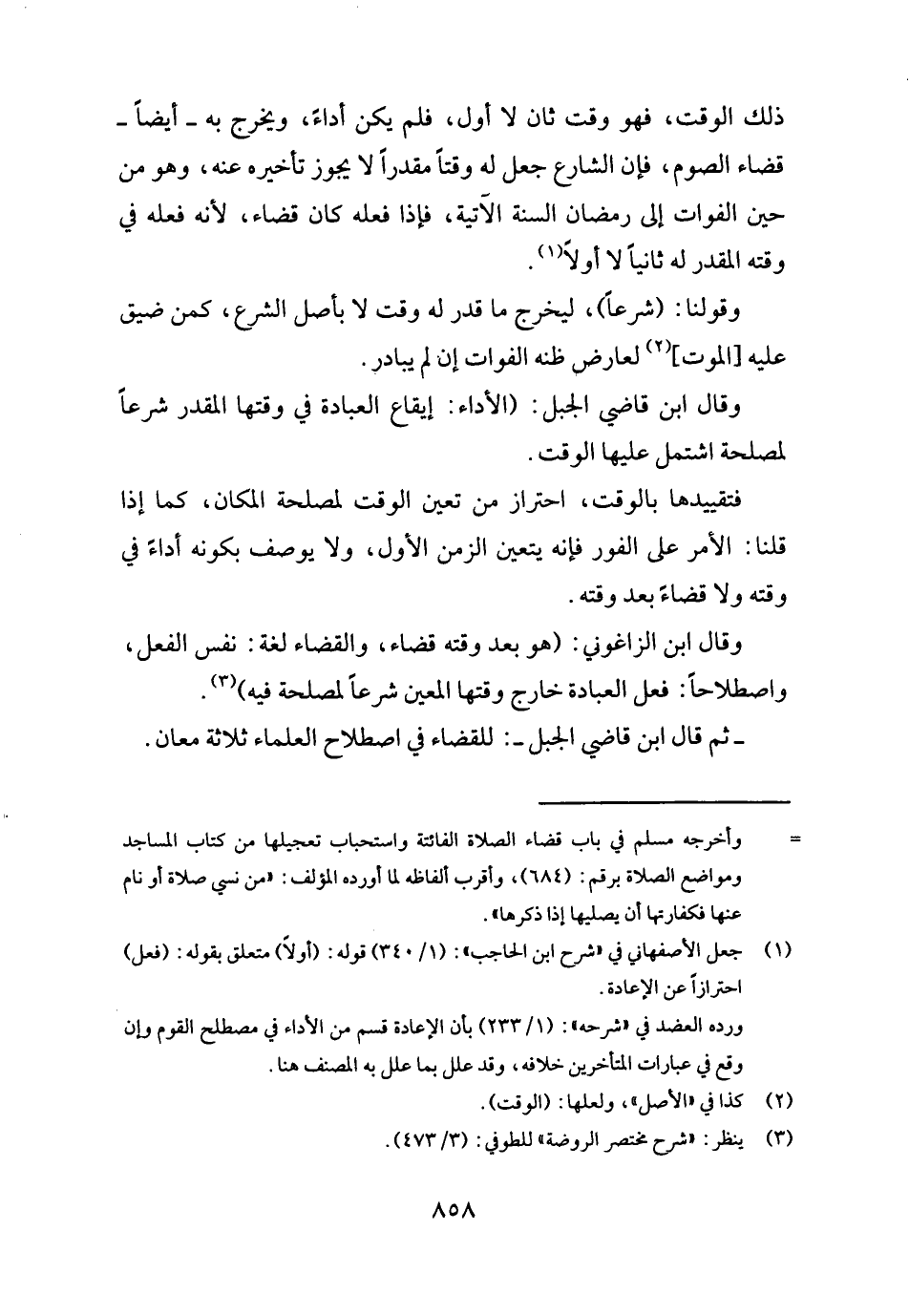 ذَلِك الْوَقْت، فَهُوَ وَقت ثَان لَا أول، فَلم يكن أَدَاء، وَيخرج بِهِ أَيْضا قَضَاء الصَّوْم، فَإِن الشَّارِع جعل لَهُ وقتا مُقَدرا لَا يجوز تَأْخِيره عَنهُ، وَهُوَ من حِين الْفَوات إِلَى رَمَضَان السّنة الْآتِيَة، فَإِذا فعله كَانَ قَضَاء، لِأَنَّهُ فعله فِي وقته الْمُقدر لَهُ ثَانِيًا لَا أَولا.