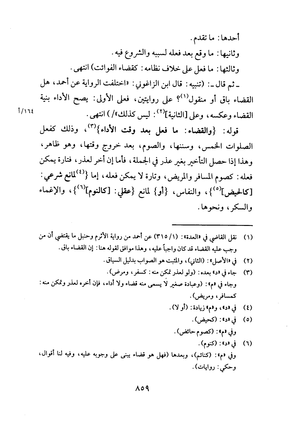 قَوْله: {وَالْقَضَاء: مَا فعل بعد وَقت الْأَدَاء} ، وَذَلِكَ كَفعل الصَّلَوَات الْخمس، وسننها، وَالصَّوْم، بعد خُرُوج وَقتهَا، وَهُوَ ظَاهر، وَهَذَا إِذا حصل التَّأْخِير بِغَيْر عذر فِي الْجُمْلَة، فَأَما إِن أخر لعذر، فَتَارَة يُمكن فعله: كَصَوْم الْمُسَافِر وَالْمَرِيض، وَتارَة لَا يُمكن فعله، إِمَّا {لمَانع شَرْعِي: [كالحيض] } ، وَالنّفاس، {أَو} لمَانع [عَقْلِي: [كالنوم] } ، وَالْإِغْمَاء وَالسكر، وَنَحْوهَا.