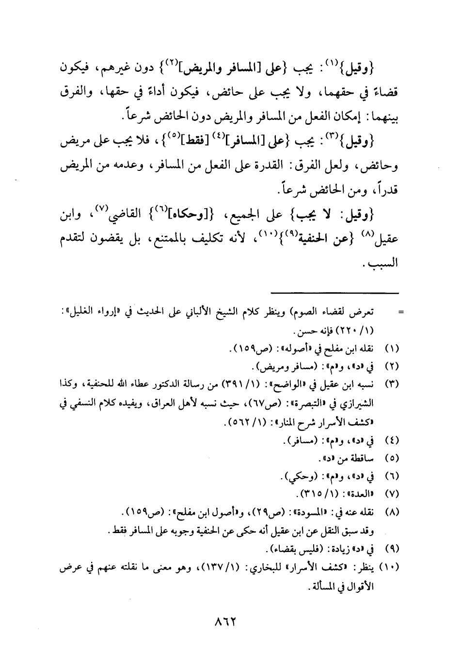 {وَقيل} : يجب {على [الْمُسَافِر] [فَقَط] } ، فَلَا يجب على مَرِيض وحائض، وَلَعَلَّ الْفرق الْقُدْرَة على الْفِعْل من الْمُسَافِر، وَعَدَمه من الْمَرِيض قدرا، وَمن الْحَائِض شرعا.
