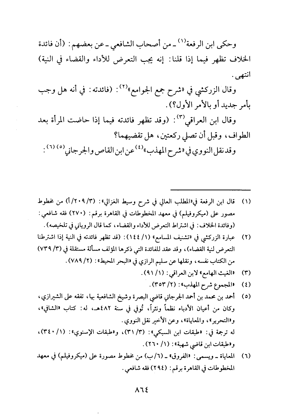 وَقَالَ ابْن الْعِرَاقِيّ: (وَقد تظهر فَائِدَته فِيمَا إِذا حَاضَت الْمَرْأَة بعد الطّواف، وَقبل أَن تصلي رَكْعَتَيْنِ، هَل تقضيهما؟