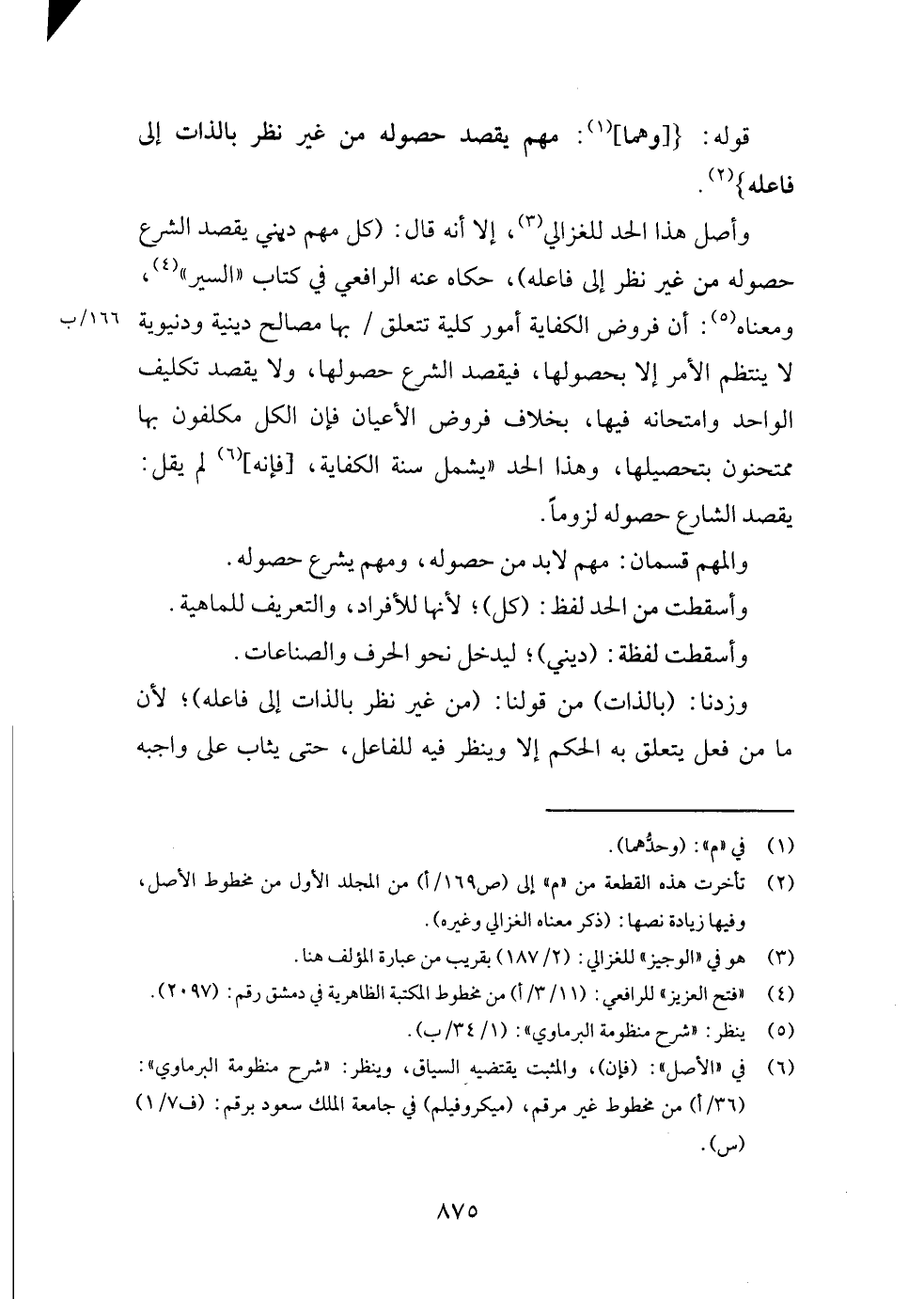وأصل هَذَا الْحَد للغزالي، إِلَّا أَنه قَالَ: (كل مُهِمّ ديني يقْصد الشَّرْع حُصُوله من غير نظر إِلَى فَاعله) ، حَكَاهُ عَنهُ الرَّافِعِيّ فِي كتاب " السّير "، وَمَعْنَاهُ: أَن فروض الْكِفَايَة أُمُور كُلية تتَعَلَّق بهَا مصَالح دينية ودنيوية لَا يَنْتَظِم الْأَمر إِلَّا بحصولها، فيقصد الشَّرْع حُصُولهَا، وَلَا يقْصد تَكْلِيف الْوَاحِد وامتحانه فِيهَا، بِخِلَاف فروض الْأَعْيَان فَإِن الْكل مكلفون بهَا ممتحنون بتحصيلها، وَهَذَا الْحَد " يَشْمَل سنة الْكِفَايَة، [فَإِنَّهُ] لم يقل: يقْصد الشَّارِع حُصُوله لُزُوما.