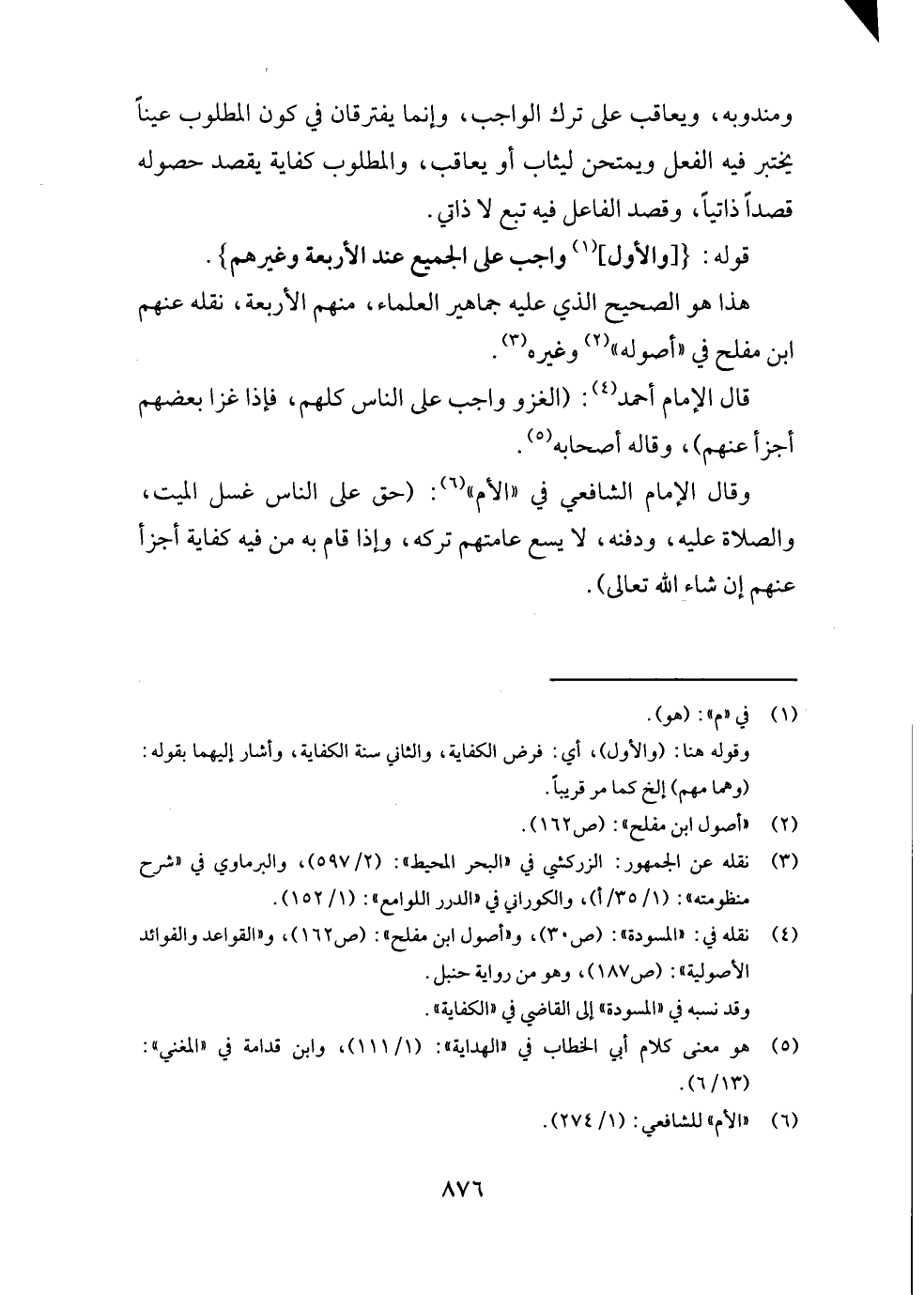 ومندوبه، ويعاقب على ترك الْوَاجِب، وَإِنَّمَا يفترقان فِي كَون الْمَطْلُوب عينا يختبر فِيهِ الْفِعْل ويمتحن ليثاب أَو يُعَاقب، وَالْمَطْلُوب كِفَايَة يقْصد حُصُوله قصدا ذاتياً، وَقصد الْفَاعِل فِيهِ تبع لَا ذاتي.